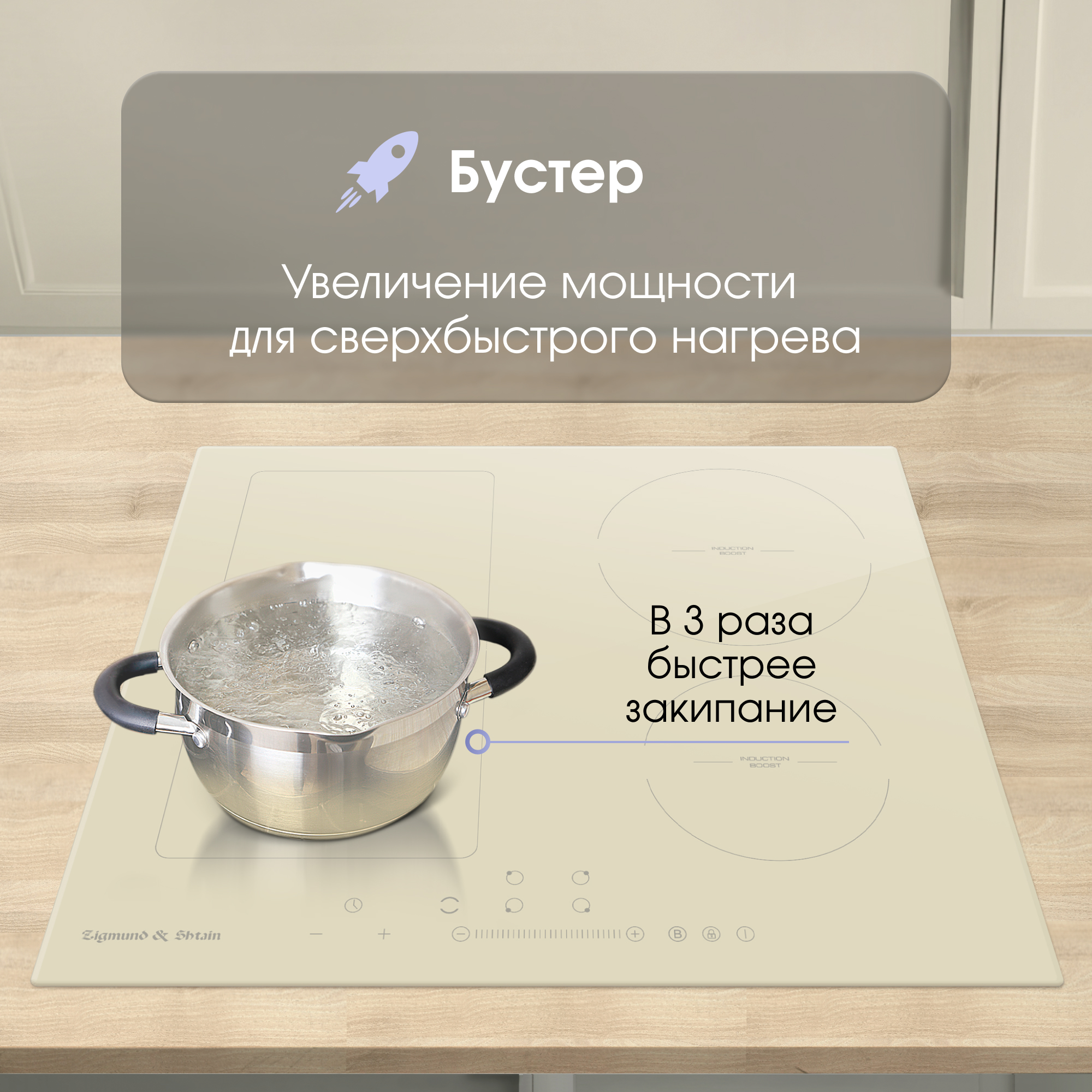 ·                    Функция «Бустер» включает конфорку на максимальную мощность, что позволяет в разы быстрее нагреть, например, кастрюлю с водой до кипения.