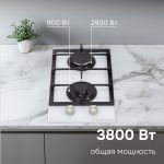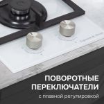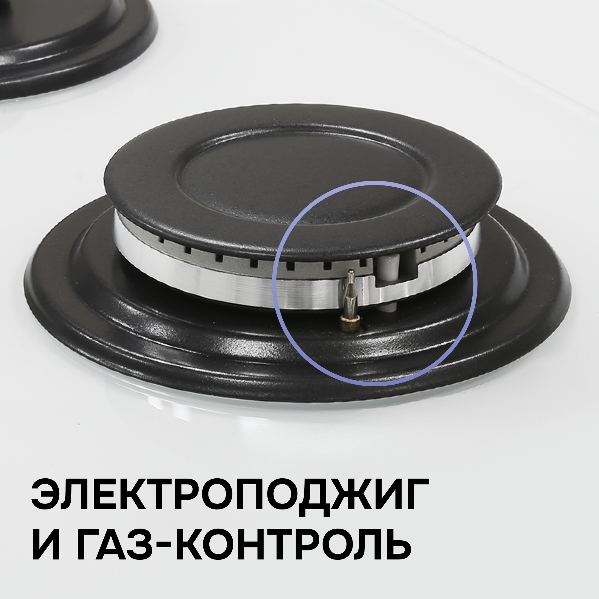 Варочная поверхность удобна и безопасна в использовании. Фронтально расположенные переключатели, оснащенные электроподжигом, позволяют осуществлять плавное регулирование силы пламени. Две конфорки мощностью 1000 Вт и 2500 Вт удовлетворят любые кулинарные потребности. Система газ-контроля обеспечит автоматическое отключение газа в случае отсутствия пламени.