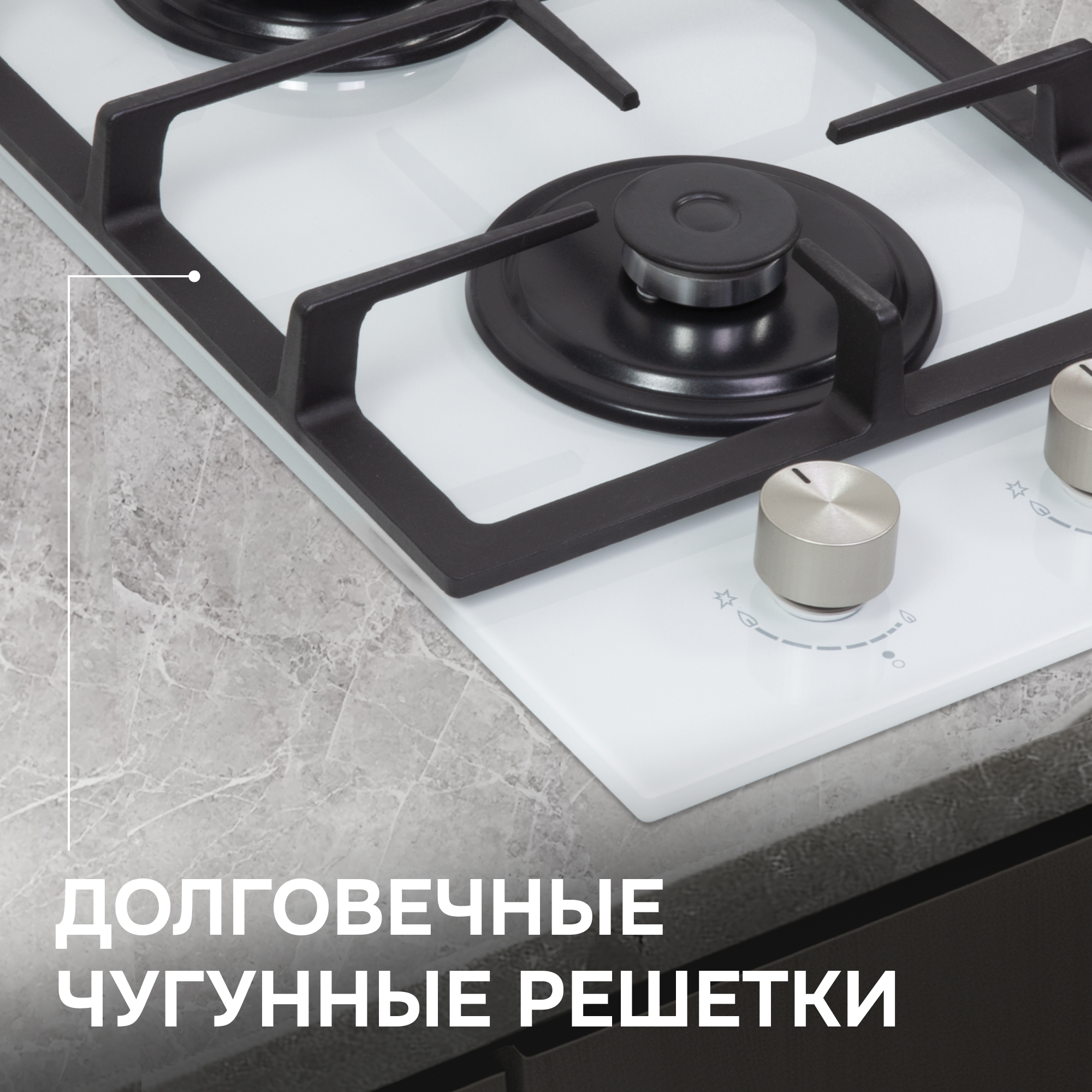 Поверхность из ударопрочного закаленного стекла белого цвета и эстетичные поворотные переключатели придают внешнему виду плиты особый стиль. Модель отличается легкостью в уходе и безопасностью использования. Чугунные решетки обеспечивают стабильность геометрических параметров на протяжении всего времени пользования плитой.
