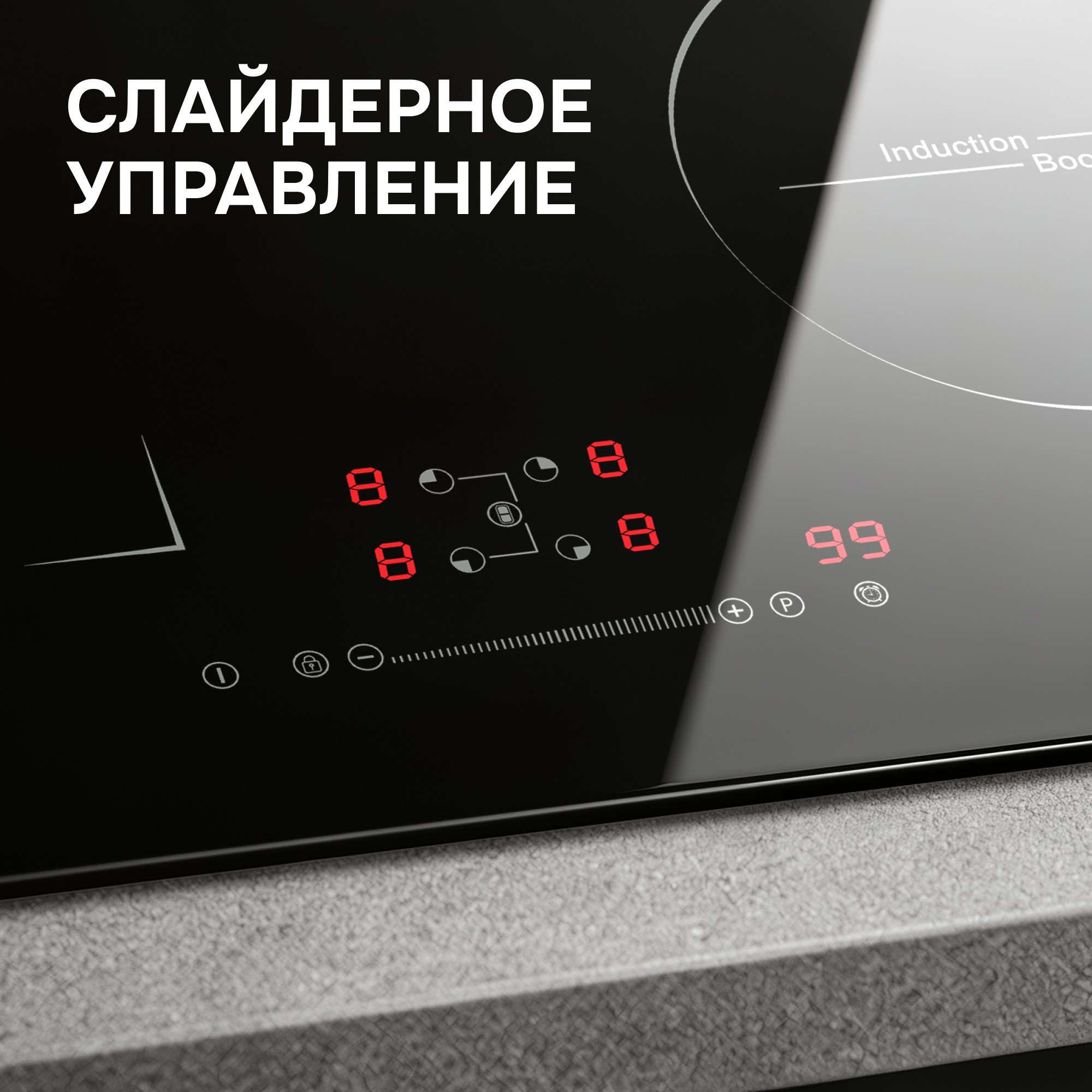 • Сенсорная панель со слайдером делает управление интуитивно понятным. Чтобы включить прибор и выставить нужную мощность нагрева, не нужны физические усилия. Достаточно коснуться кнопки включения и индикатора конфорки, а затем провести пальцем по слайдеру, пока на LED-дисплее не появится нужная мощность.
