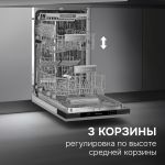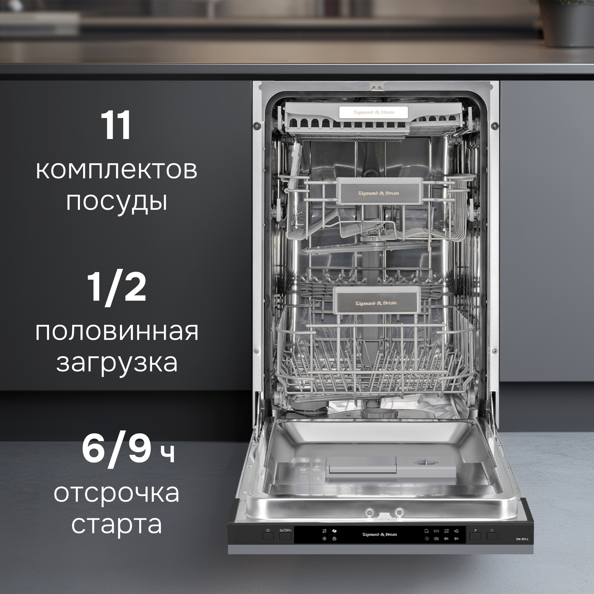 Посудомоечная машина Zigmund & Shtain DW 309.4 сочетает в себе компактность, многофункциональность, экономию и качество. ПММ легко отмоет 11 комплектов посуды, тщательно ополаскивает поверхность столовых приборов, не оставляя следов моющих средств. Несмотря на многофункциональность, имеет простую панель управления с интуитивно понятным интерфейсов. Встраиваемая техника гармонично вписывается в современный интерьер кухни и экономит не только воду и ваше время, но и место даже на небольшой по площади кухни.