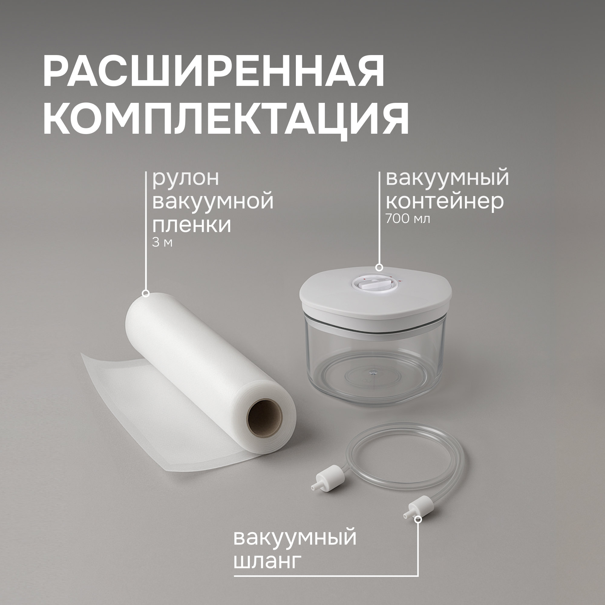 Комплектация | вакуумный упаковщик, вакуумный шланг, контейнер для вакуумирования, рулон для изготовления пакетов, гарантийный талон, инструкция |