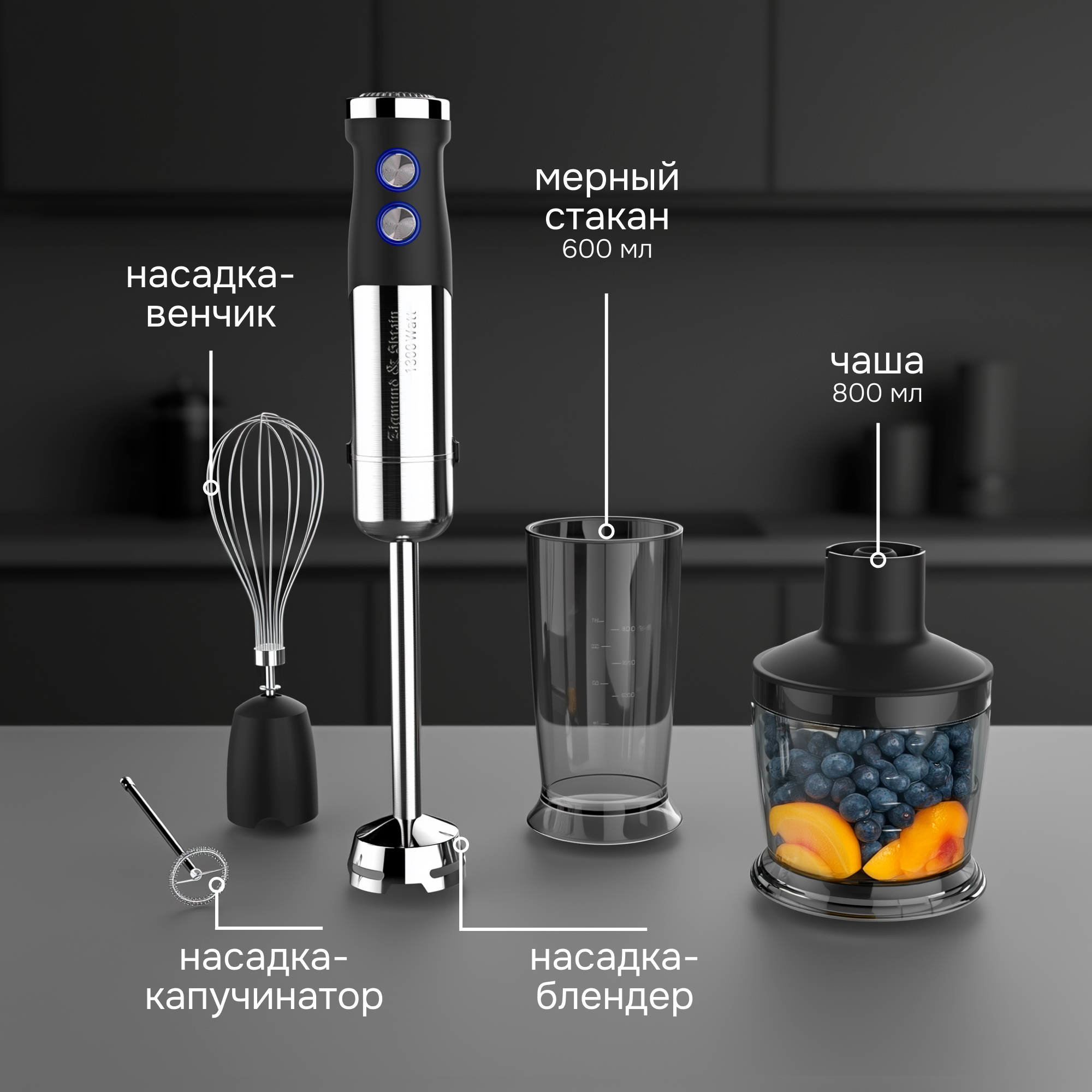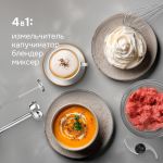 • Расширенная комплектация: насадка-блендер, насадка-венчик, насадка-измельчитель, насадка-капучинатор, чаша для измельчения и стакан для смешивания