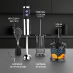 | Комплектация | блок электродвигателя, насадка-блендер из нержавеющей стали, насадка-венчик, насадка-капучинатор, держатель насадки-венчика, нож-измельчитель, чаша измельчителя (800 мл), стакан для смешивания )600 мл |