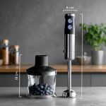 В комплекте идут съемная насадка-блендер, нож-измельчитель, венчик и насадка-капучинатор, которые быстро и качественно измельчают, взбивают и смешивают любые продукты. Благодаря высокой мощности и наличию 12 скоростей и Турборежиму, обработка продуктов и доведение их до желаемой консистенции занимает считанные секунды.