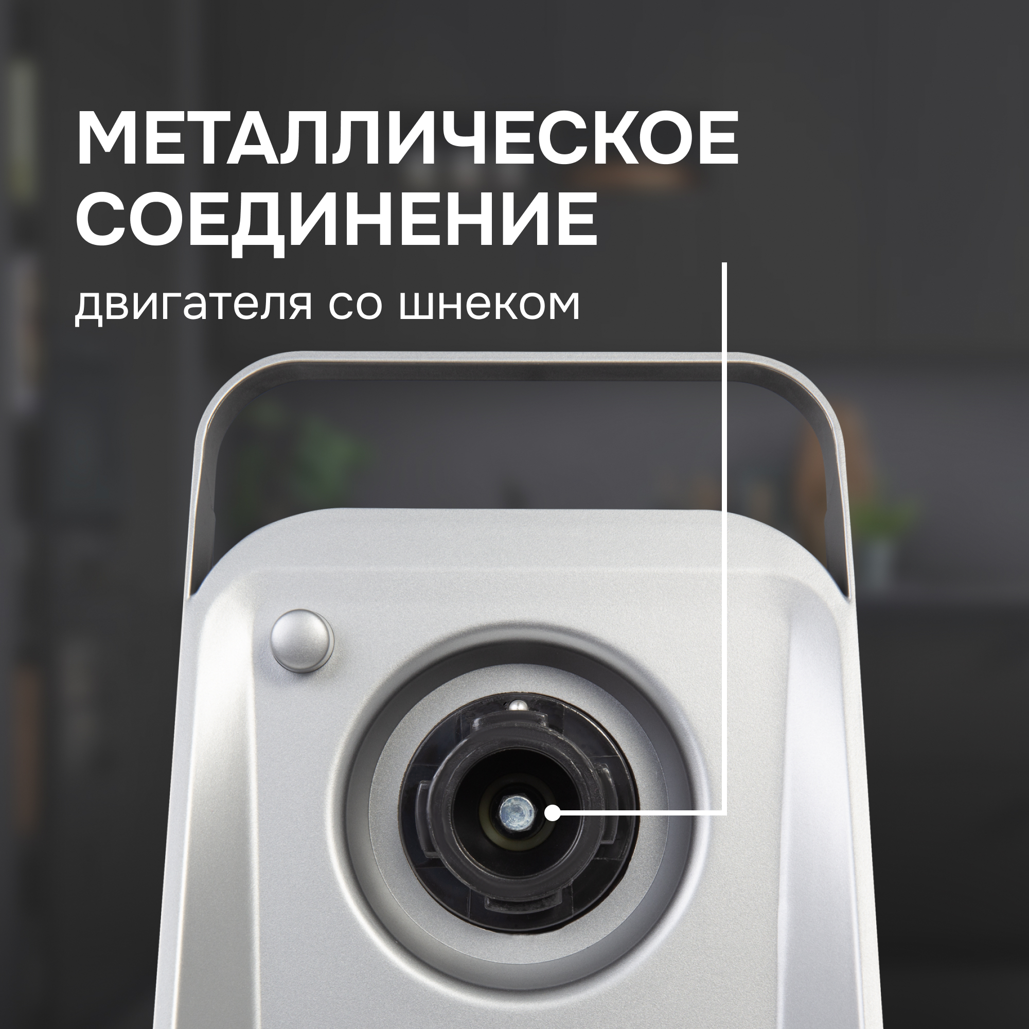 Устойчивость к повышенным нагрузкам и повышенную прочность обеспечивает надежное соединение шнека с электрическим двигателем. Для использования мясорубки не требуется ее жесткая фиксация к столу, достаточно просто установить ее на ровную поверхность.