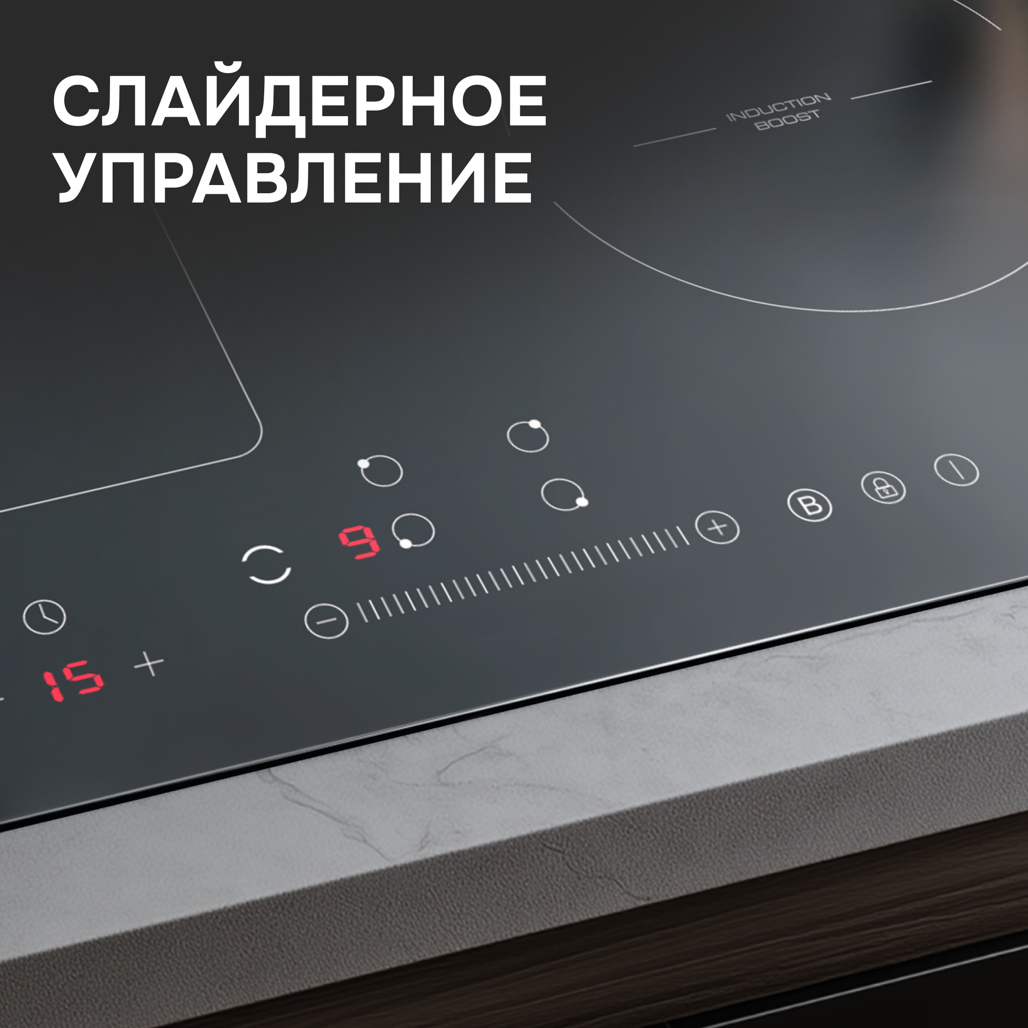 · Функция «Бустер» включает конфорку на максимальную мощность, что позволяет в разы быстрее нагреть, например, кастрюлю с водой до кипения.