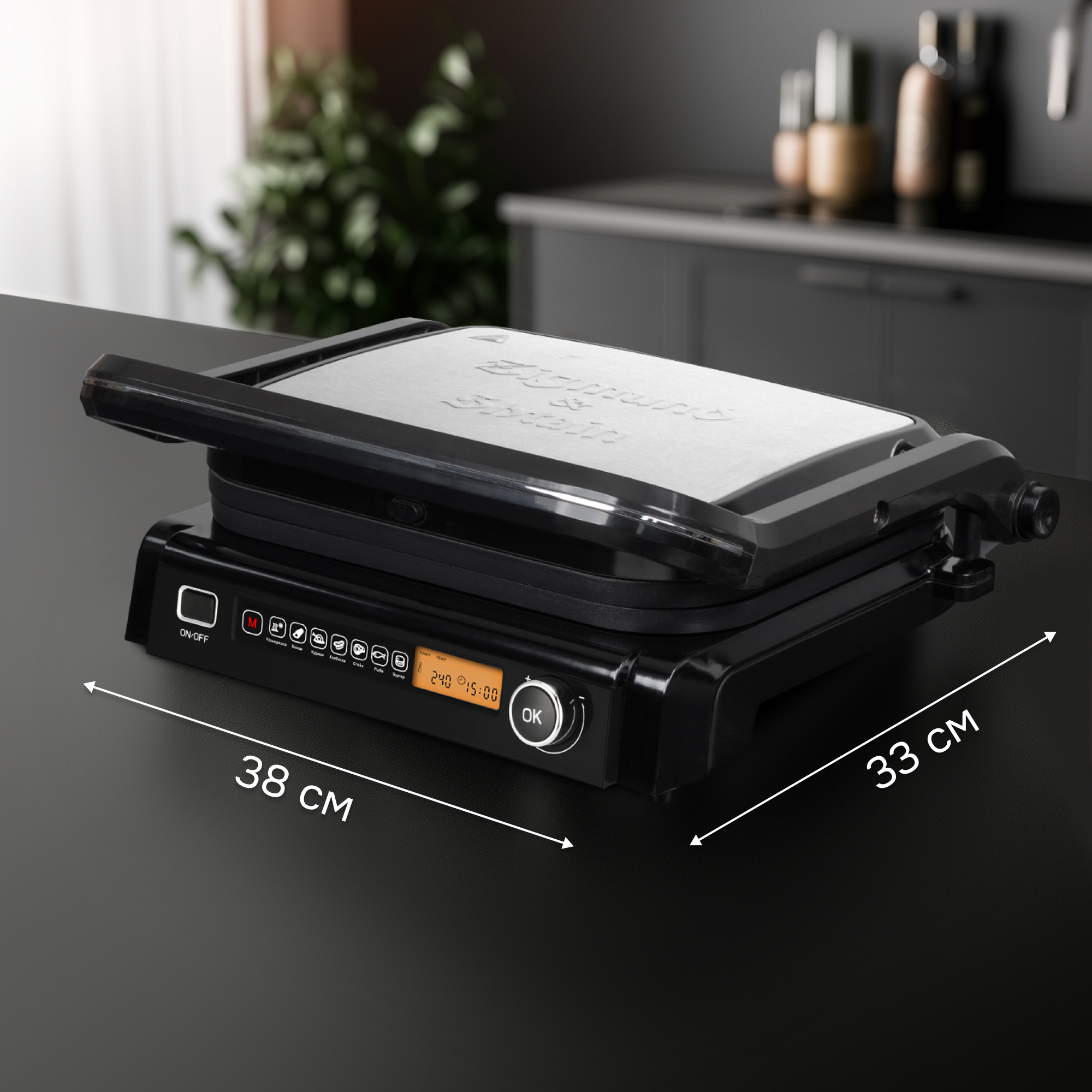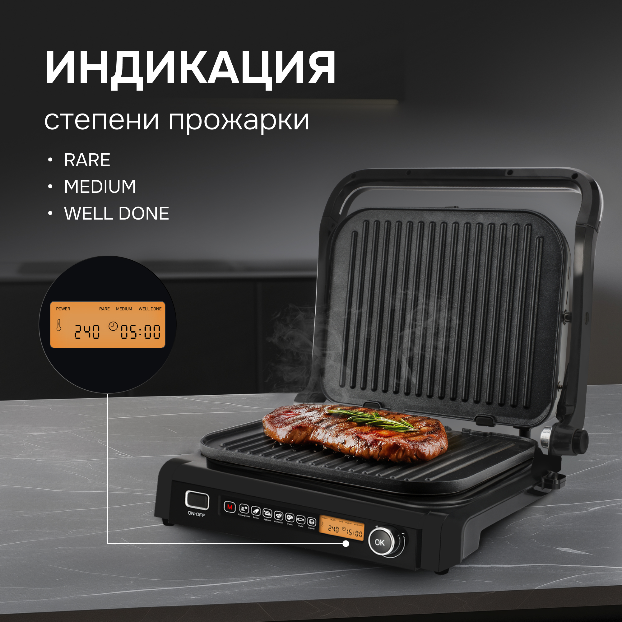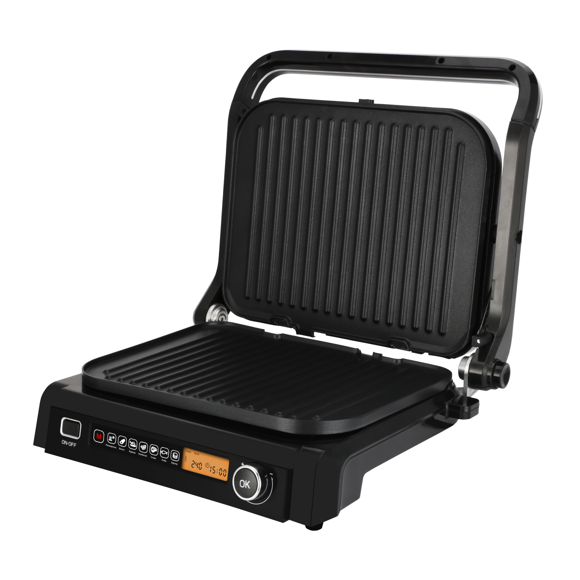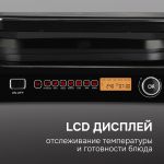 В ручном режиме гриль можно использовать в открытом на 180° виде, тогда он превращается в большую жарочную поверхность – барбекю. Выбор степени прожарки мяса осуществляется с помощью удобного LCD-дисплея, а выбор автоматической программы - при помощи удобной панели.
