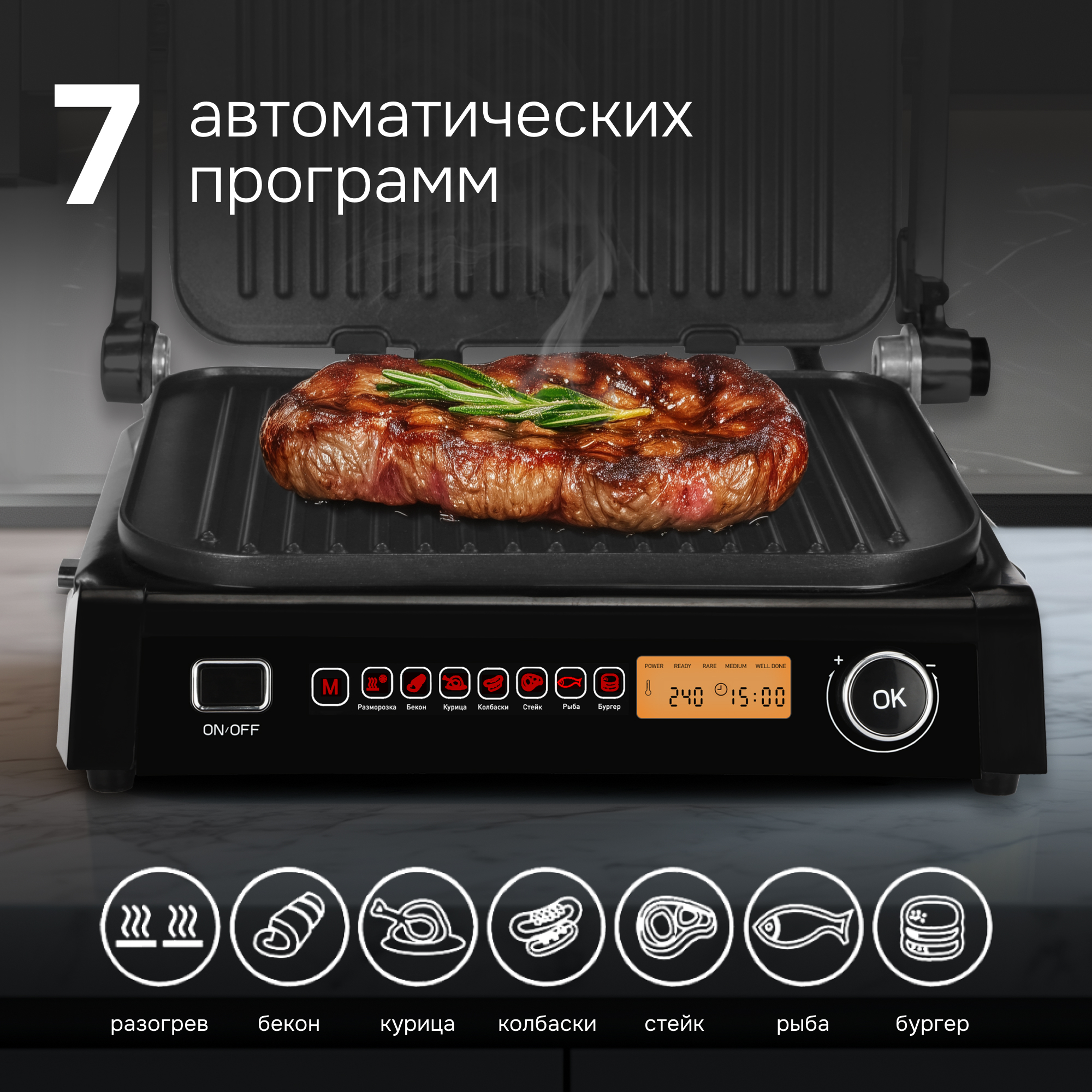 Гриль Grillmeister ZEG-938 – это инновационный прибор с сенсорным управлением и 7 автоматическими программами. Вы сами выбираете только вид продукта (программу), а температура и время приготовления выставляется автоматически.