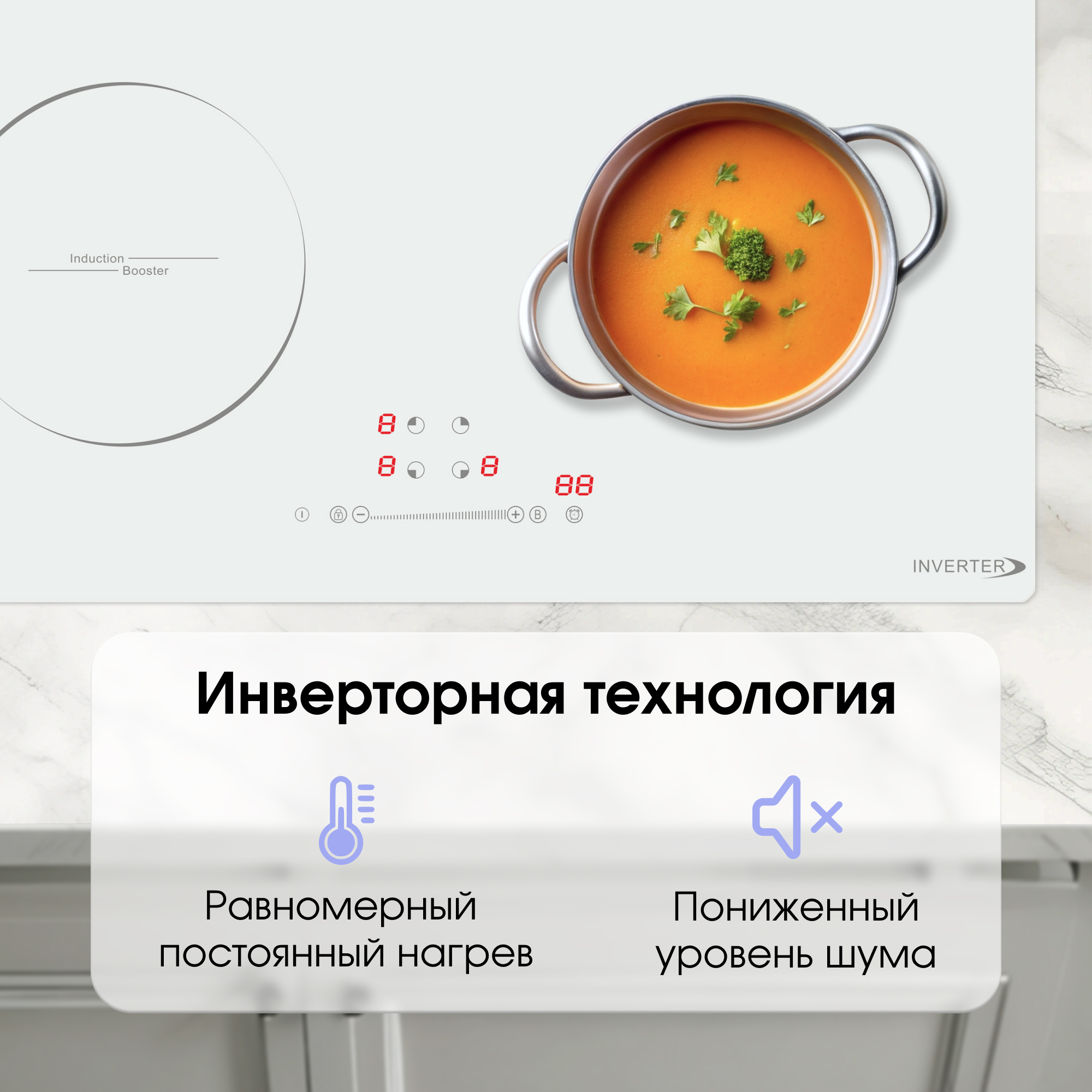 Эта варочная панель — идеальное сочетание инновационных технологий, безопасности и комфорта. Инверторная технология нагрева обеспечивает быстрый и равномерный нагрев, а широкий набор функций делает процесс приготовления максимально удобным и безопасным.