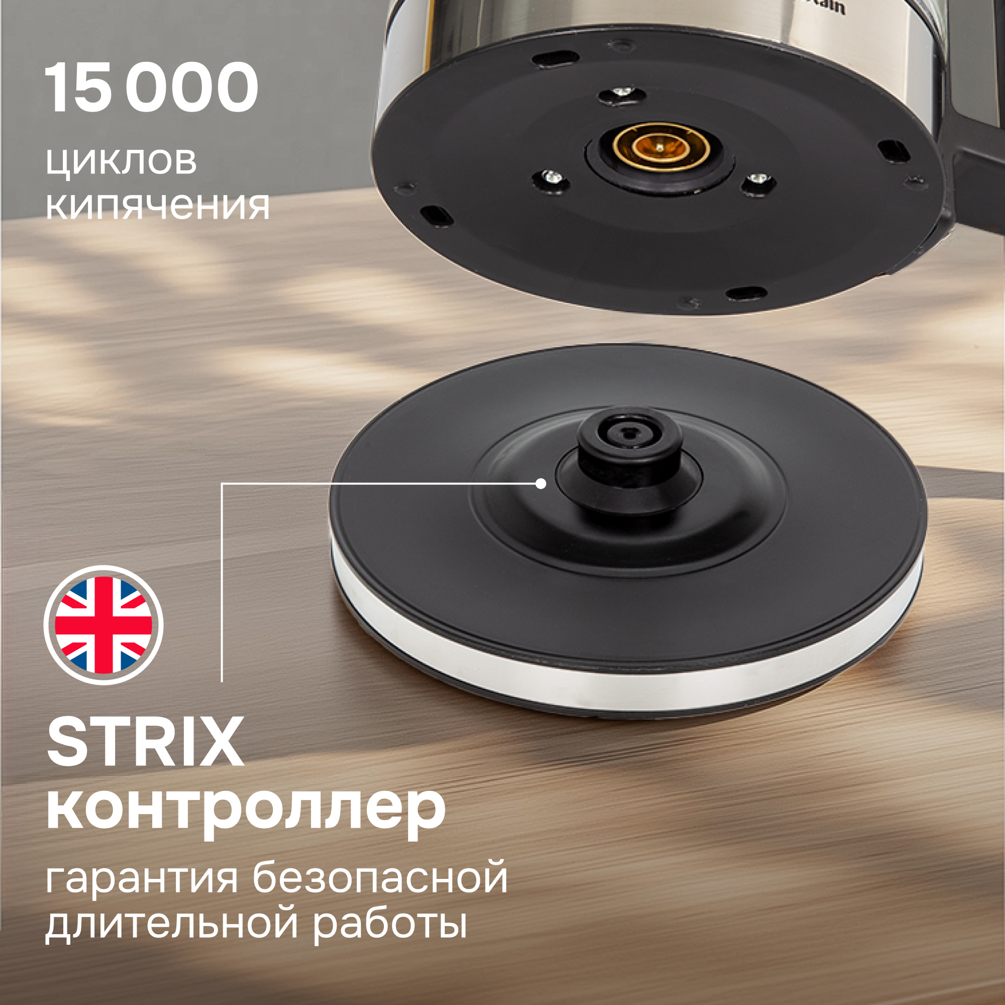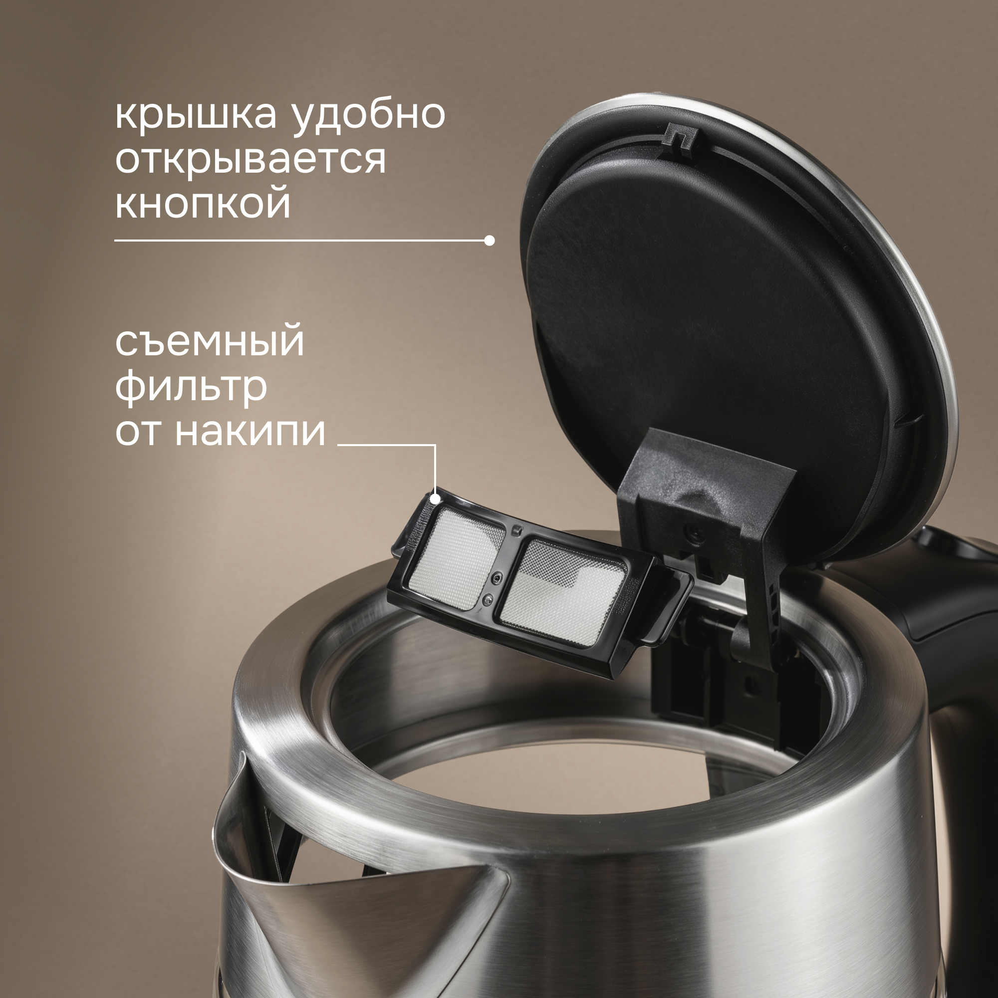 Высокое качество и надёжность обеспечит основание корпуса и крышки из нержавеющей стали. Данный материал имеет высокие антикоррозийные свойства, что исключит возможность появления ржавчины. Более того, чайник не изменяет вкус и цвет воды и соответствует всем гигиеническим свойствам.