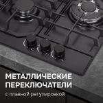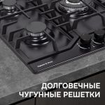 • Суммарная мощность горелок составляет 6.18 кВт, что обеспечивает быстрый нагрев и эффективное приготовление блюд. ВОК-горелка мощностью 3.4 кВт идеально подходит для интенсивной готовки, а малая горелка с мощностью 0.9 кВт подойдет для турки и разогрева малых порций.