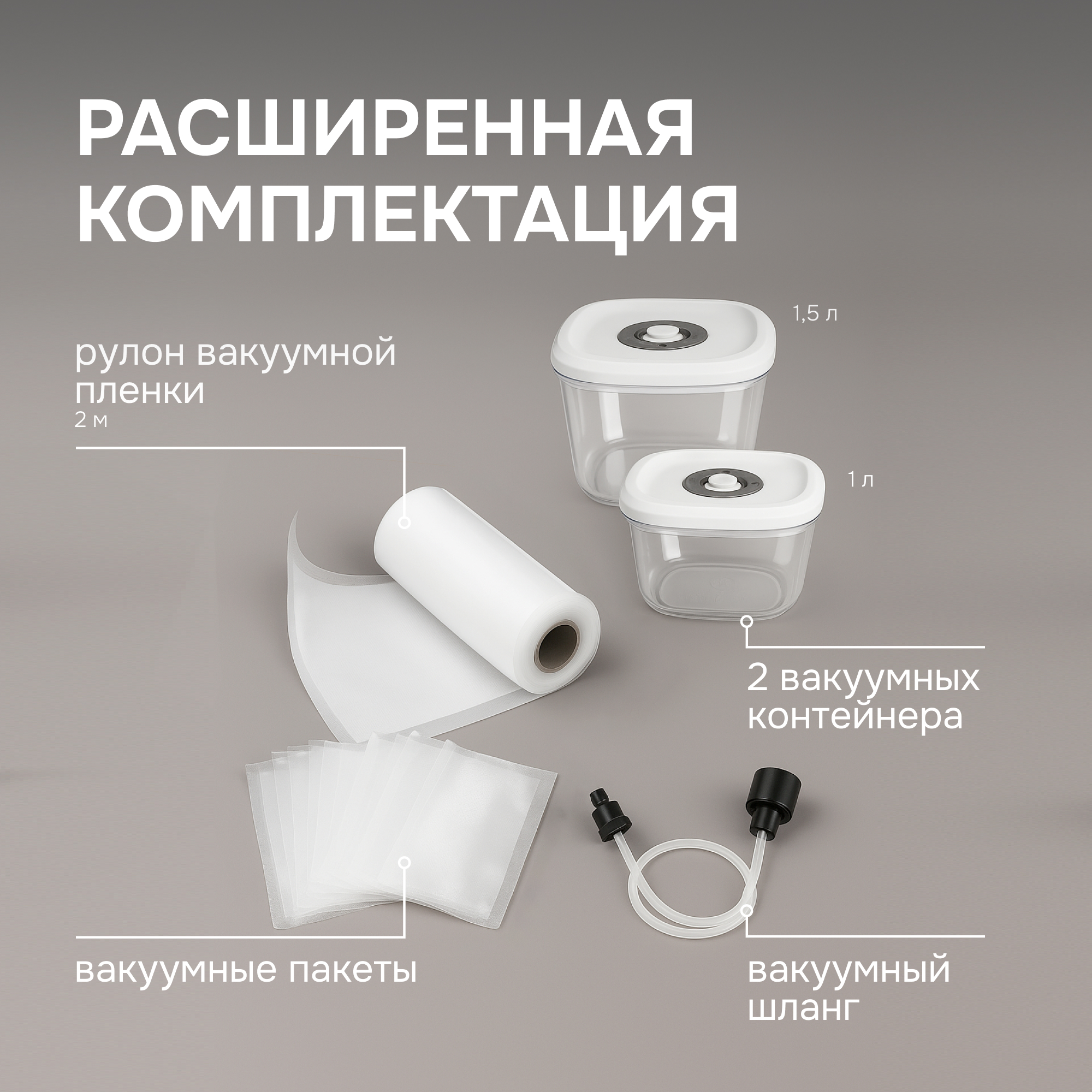 Комплектация | вакууматор, шланг, пакеты, пленка, контейнер-2 шт, инструкция |