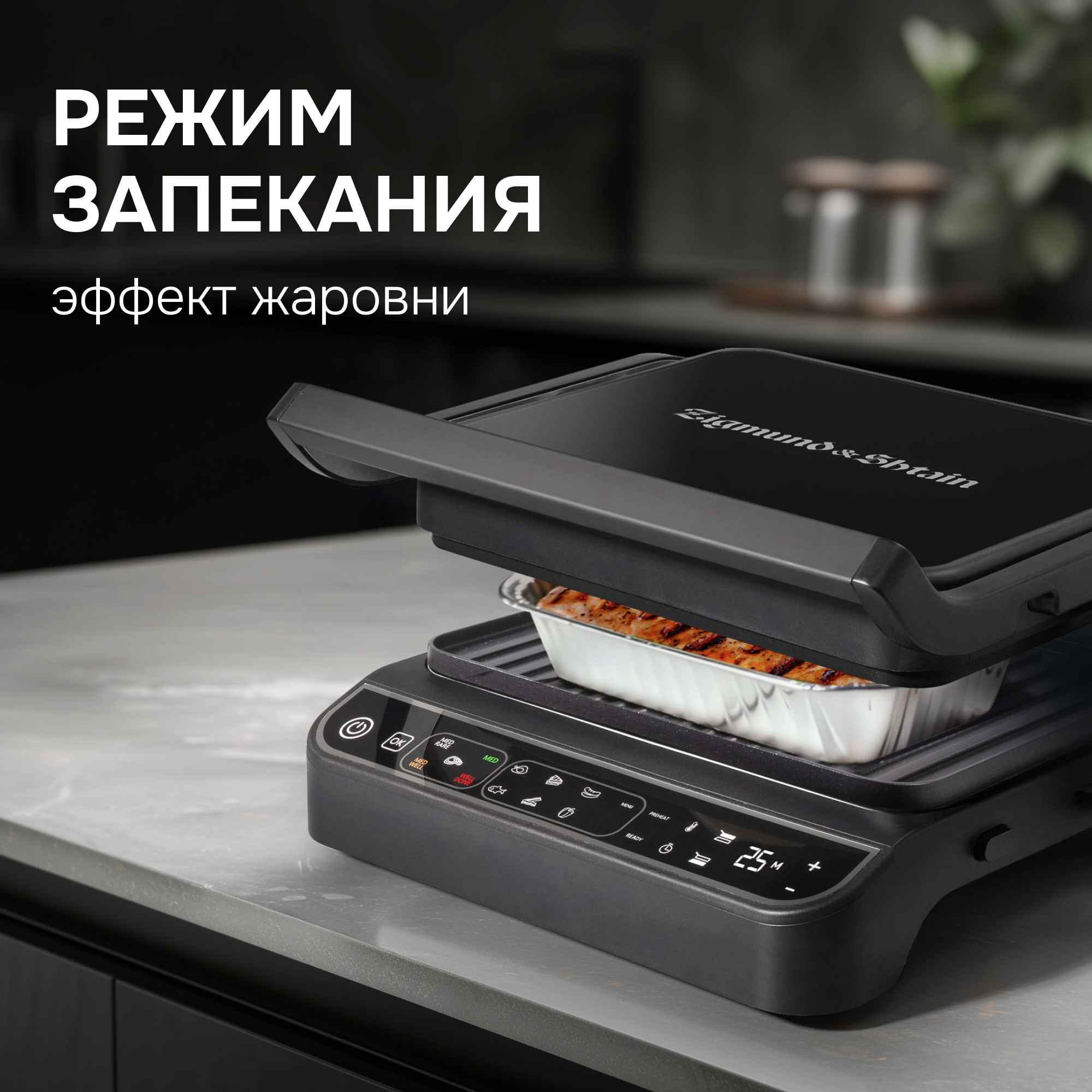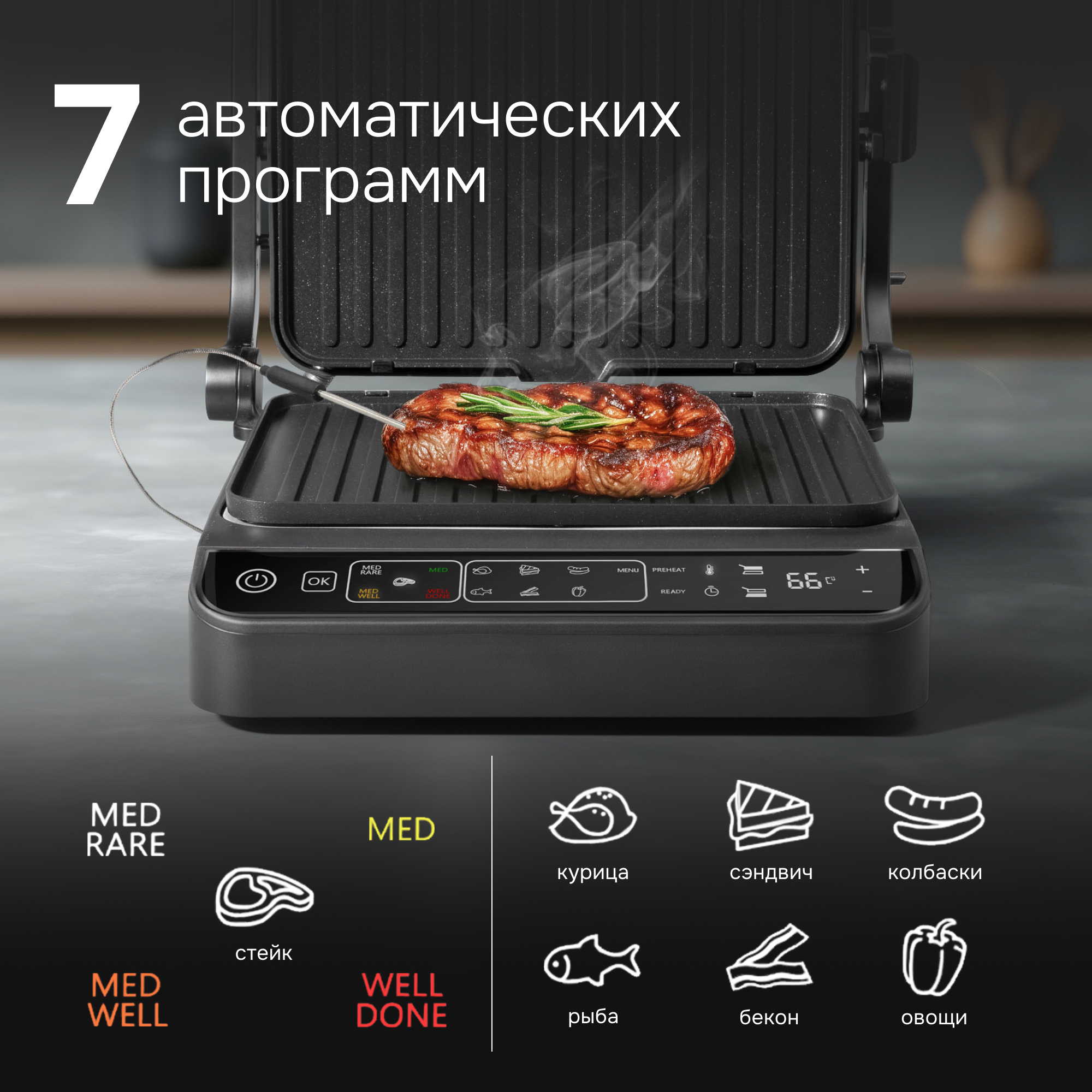 | Конструктивные особенности | 2 съемные панели которые можно мыть в посудомоечной машине, яркий сенсорный дисплей, индикация степени прожарки стейка |
