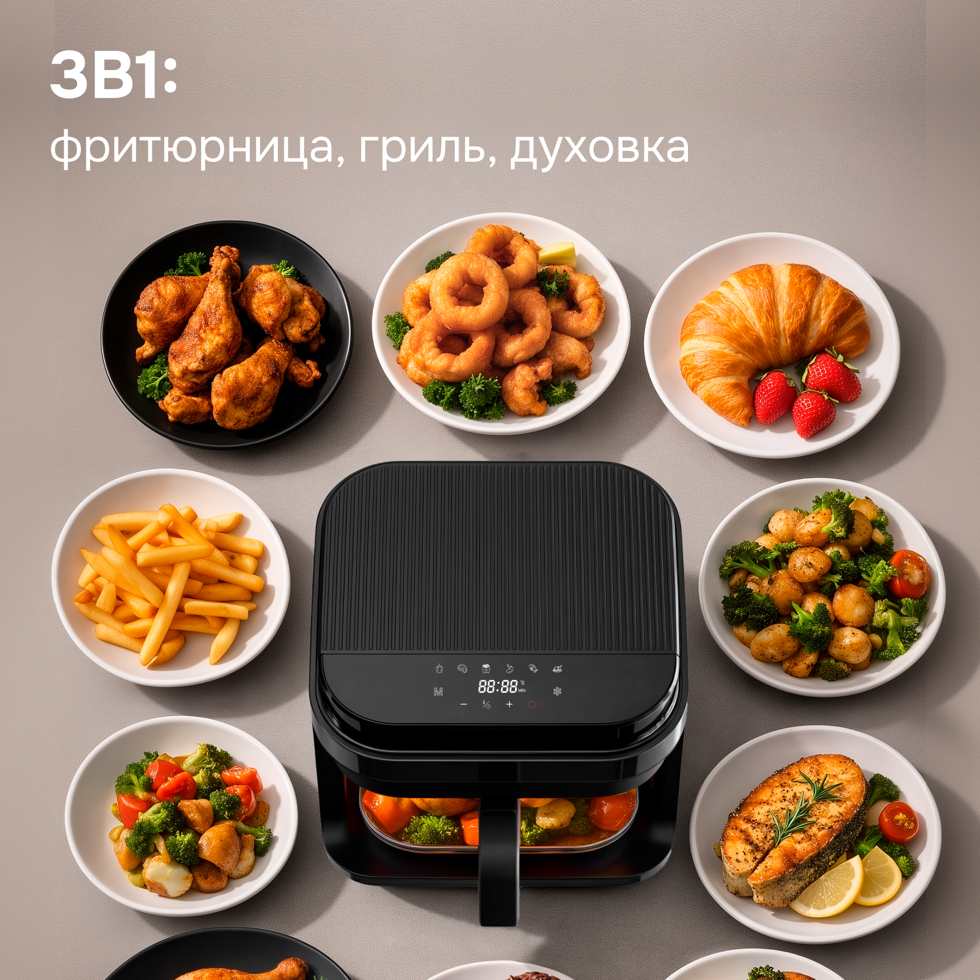 | Функциональные особенности | 3в1: фритюрница, духовка, гриль |