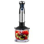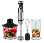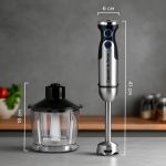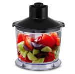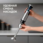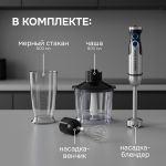 В комплекте идет насадка-венчик, насадка-блендер, чаша высокая чаша для смешивания, насадка-измельчитель и объемная чаша для измельчения.