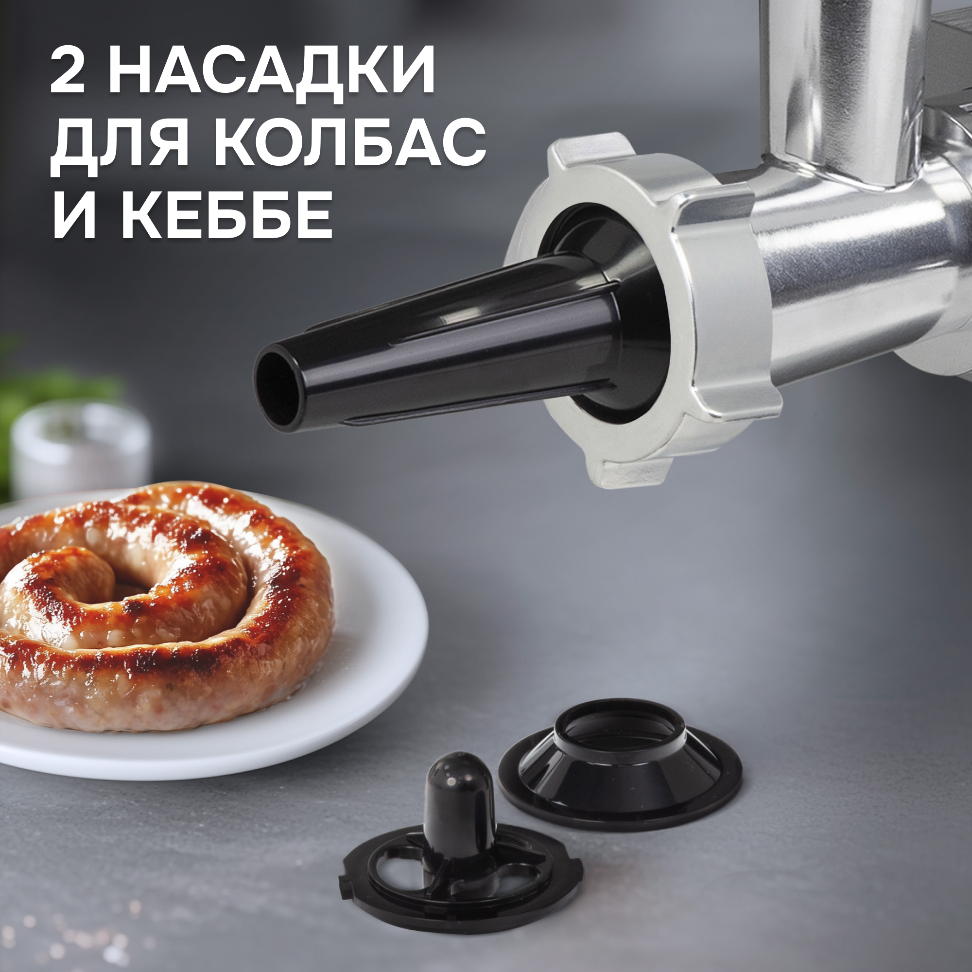- мясорубка имеет насадки для колбасных изделий, зраз и фарша, чтобы вы могли наслаждаться мясными блюдами из натуральных продуктов;