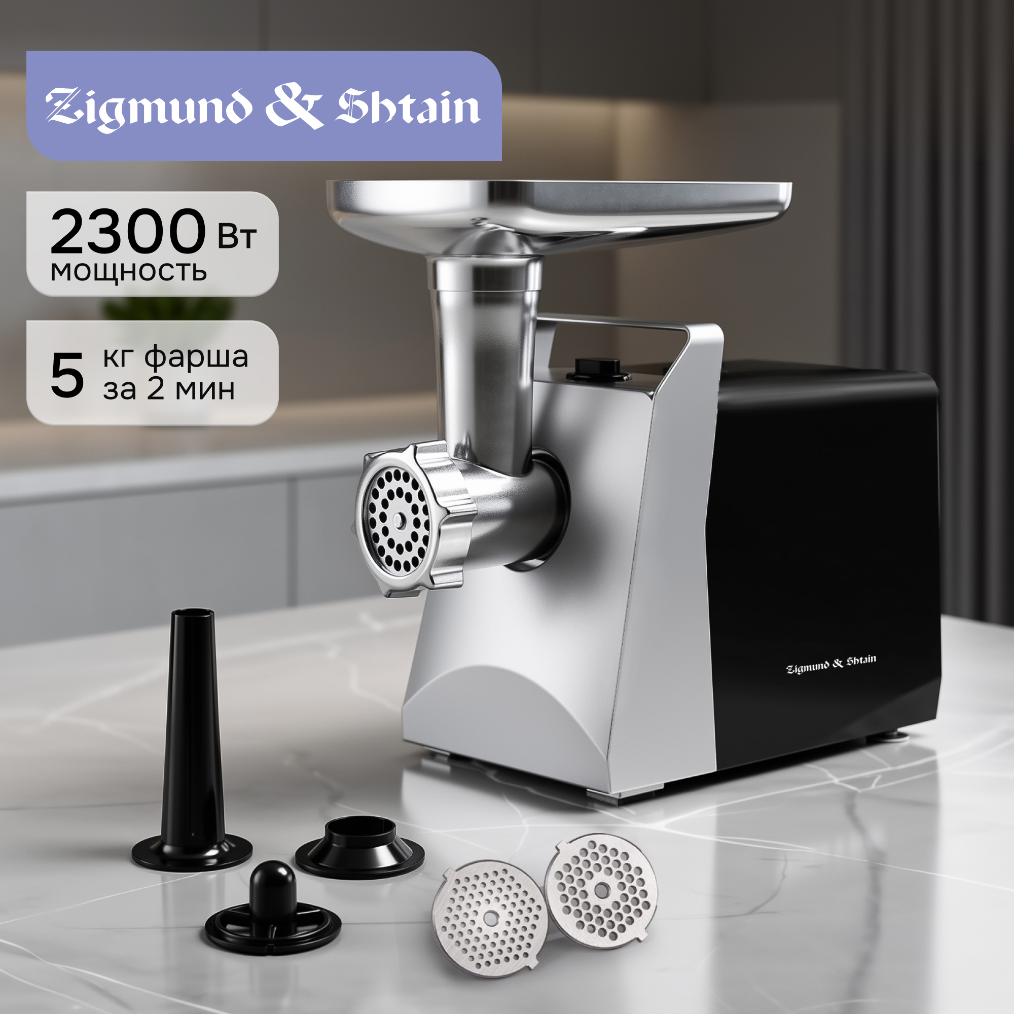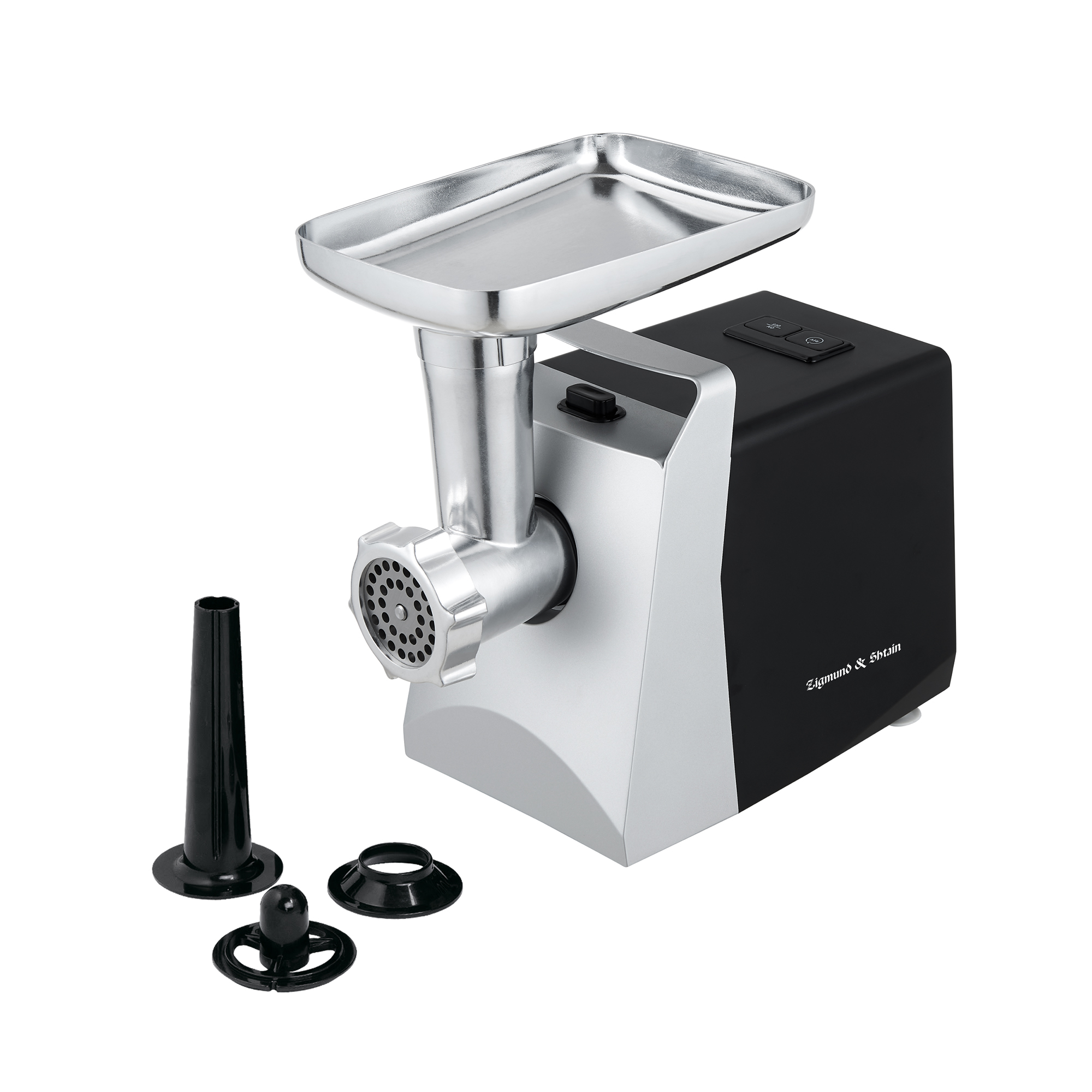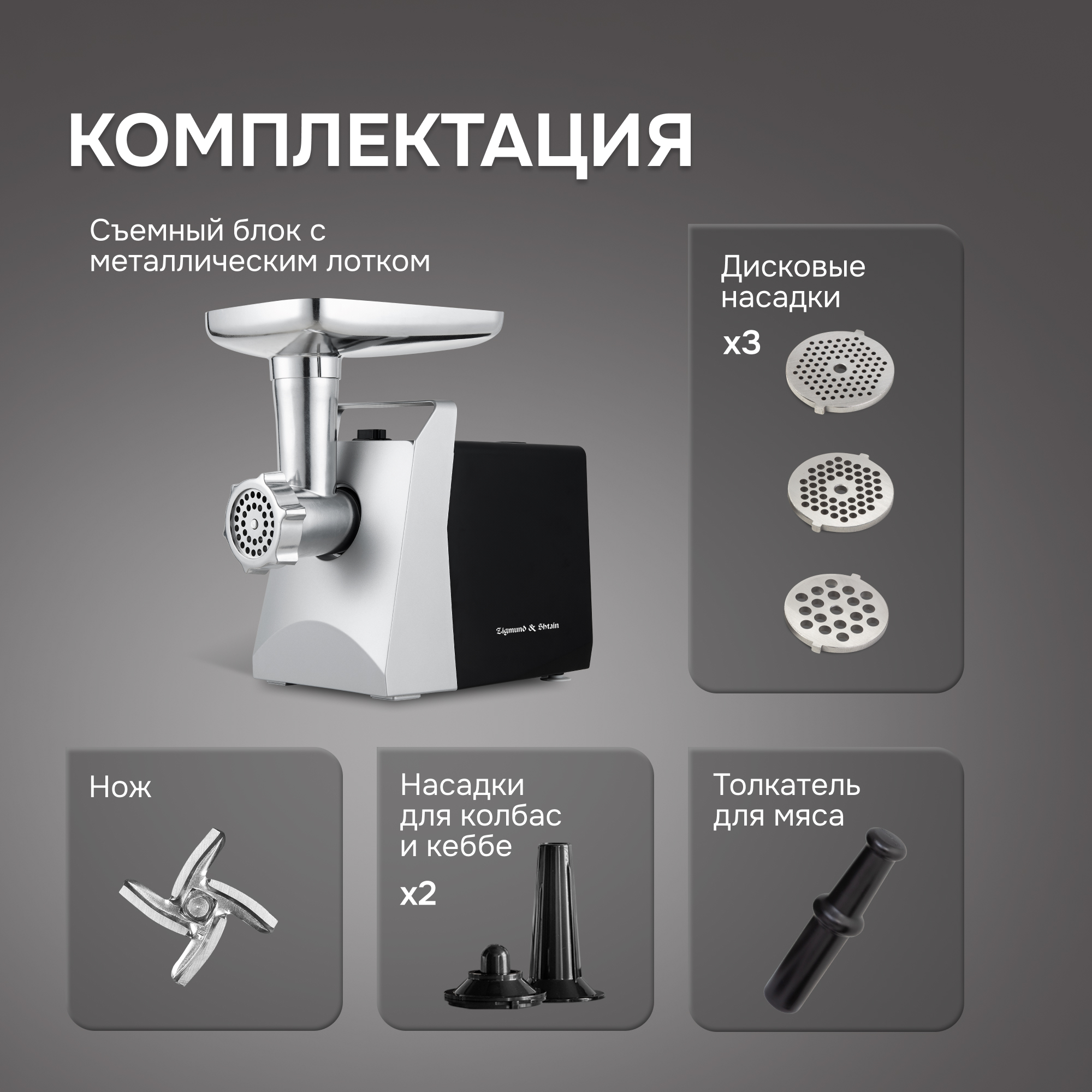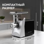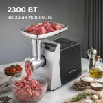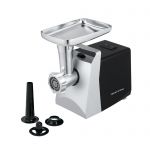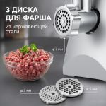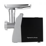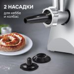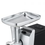 Корпус мясорубки выполнен в современном дизайне, а лоток для продуктов изготовлен для металла. В комплектацию входят 3 дисковые насадки из нержавеющей стали, а также насадки для приготовления колбас и кеббе.