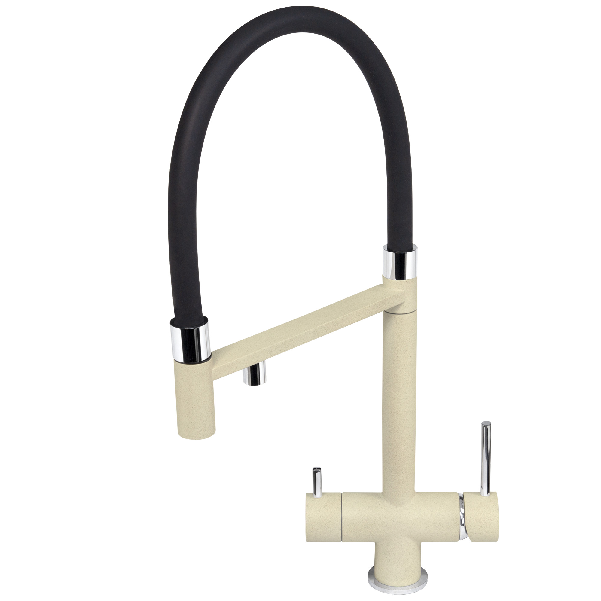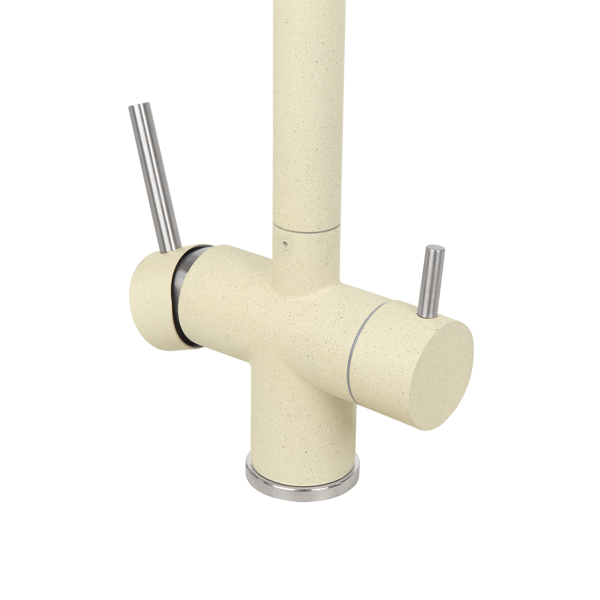 Одноизливный – фильтрованная и водопроводная вода подаются через один аэратор. Это позволяет не нарушая общего вида смесителя, получать очищенную и водопроводную воду через одно устройство.