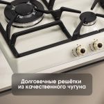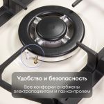 Варочная панель оснащена 2 чугунными решетками, покрывающими максимальную площадь, что обеспечивает устойчивость посуды. Плитка имеет высокий уровень безопасности. Предусмотрена система «газ-контроль», прекращающая подачу газа сразу, как только погаснет пламя. Электроподжиг в каждой ручке намного удобнее и быстрее, чем пользование спичками.