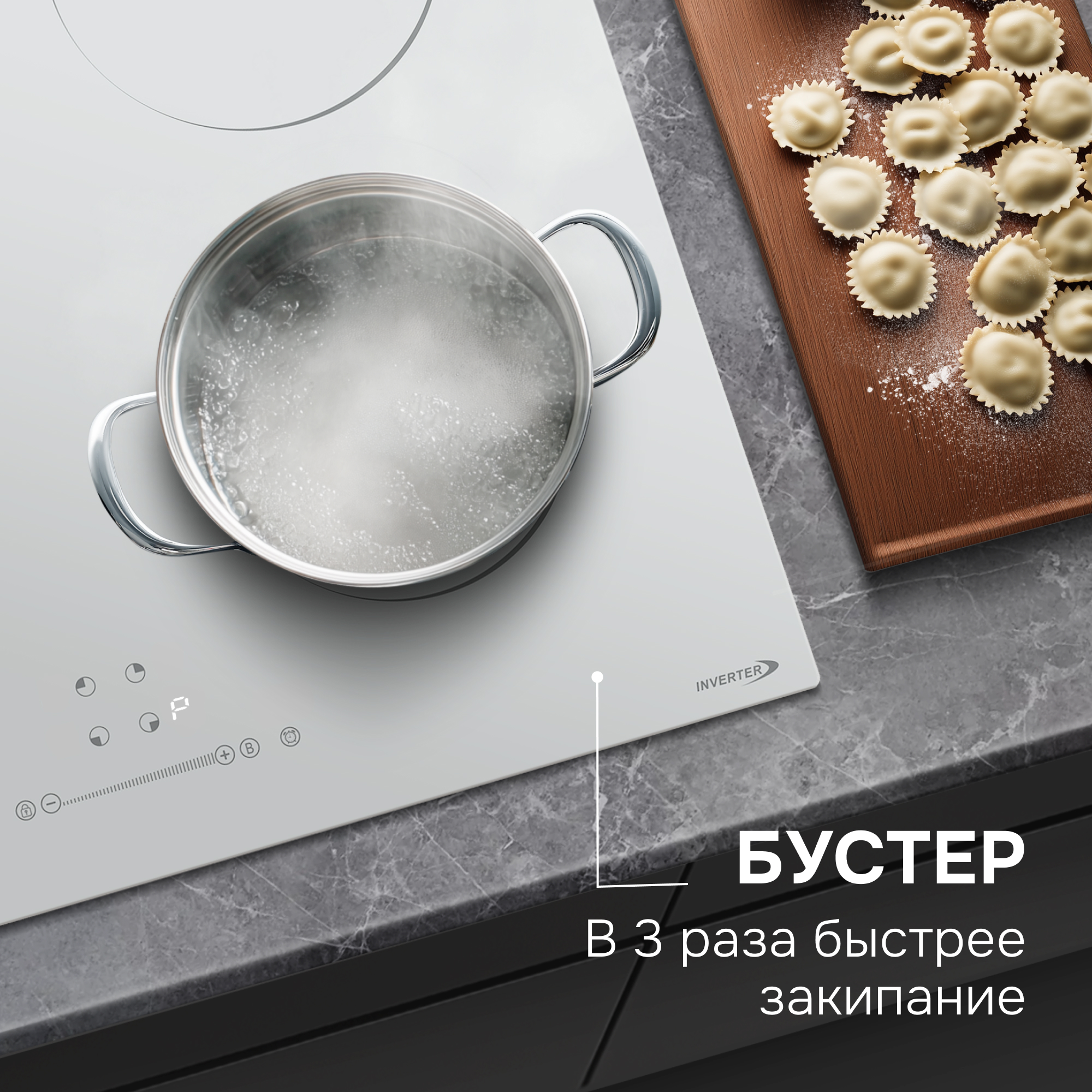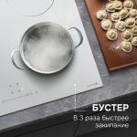 - Функция «Бустер» включает конфорку на максимальную мощность, что позволяет в разы быстрее нагреть, например, кастрюлю с водой до кипения.