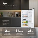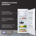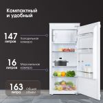 • Удобная система хранения: в холодильной камере располагаются 4 полки на дверце для бутылок и мелких упаковок, 3 стеклянных полки с защитной рамкой, и выдвижной ящик для фруктов и овощей. Общий объем составляет 163 л (холодильная камера – 1147 л, морозильная камера – 16 л).