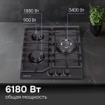 • Суммарная мощность горелок составляет 6.18 кВт, что обеспечивает быстрый нагрев и эффективное приготовление блюд. ВОК-горелка мощностью 3.4 кВт идеально подходит для интенсивной готовки, а малая горелка с мощностью 0.9 кВт подойдет для турки и разогрева малых порций.