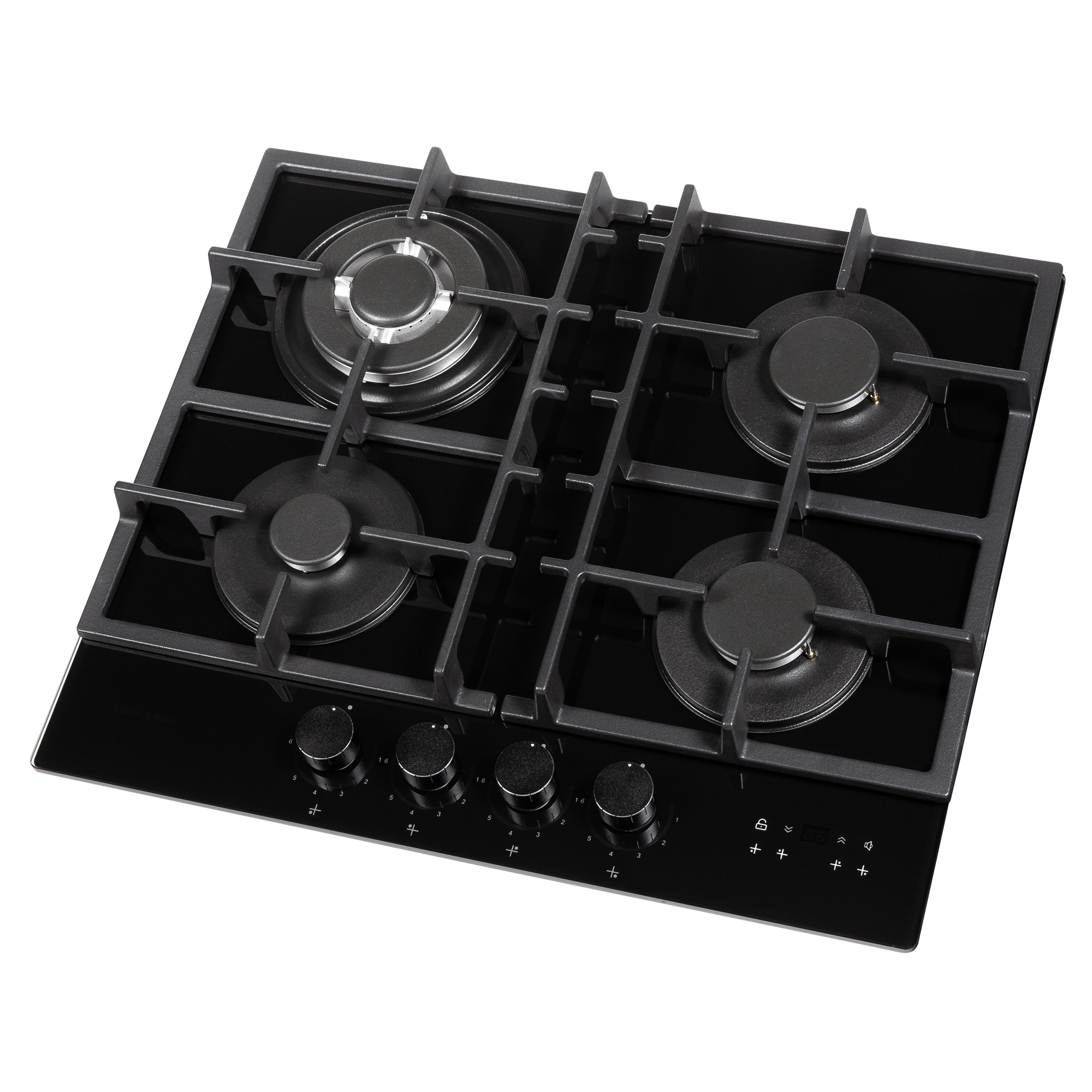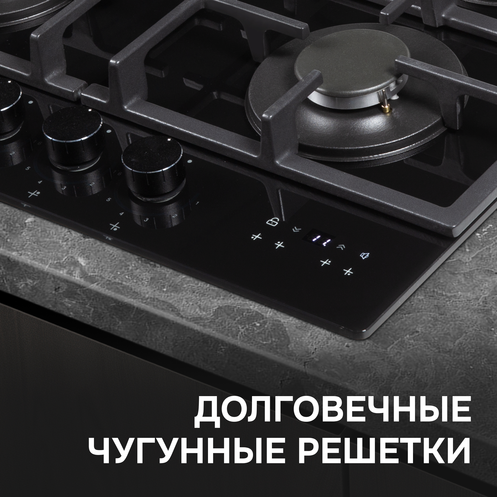 • Модель оснащена сенсорным таймером, который может работать как в режиме напоминания, так и в режиме отключения. В режиме напоминания таймер звуковым сигналом оповестит об окончании приготовления, а в режиме отключения специальный клапан перекроет подачу газа к запрограммированной конфорке.