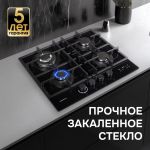 • Варочная поверхность выполнена из закаленного стекла повышенной прочности, что придает ей не только эстетичность, но и надежность. Закаленное стекло устойчиво к высоким температурам и механическим повреждениям, обеспечивая долгий срок службы и легкость в уходе.