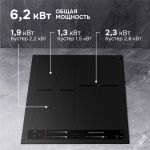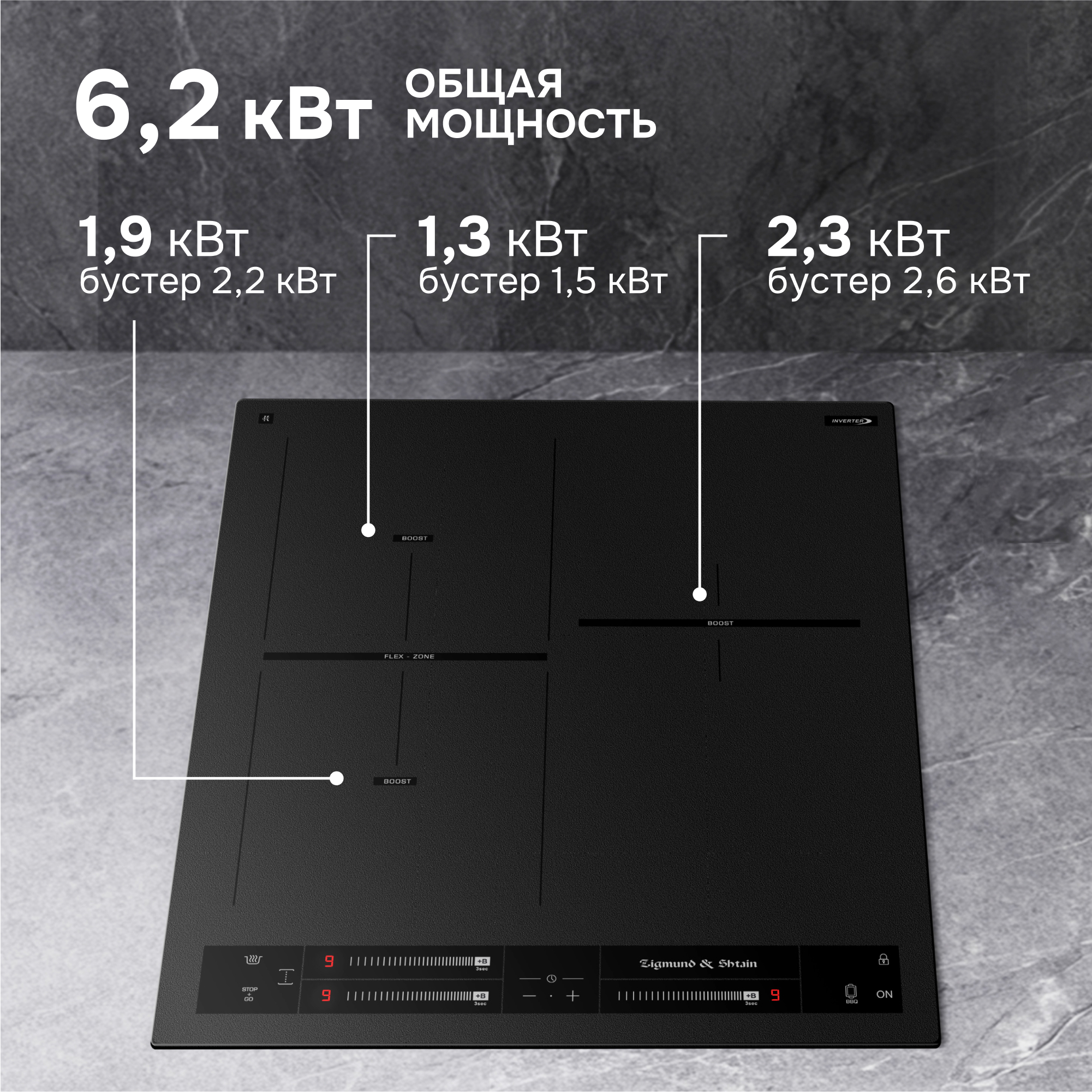 • Три зоны нагрева с мощностью 1900/2200 Вт, 1300/1500 Вт, 2300/2600 Вт, а также FLEX-зона/объединение зон нагрева с мощностью 3000/3600 Вт позволяют быстро и комфортно приготовить любимые блюда.
