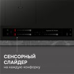 • Сенсорная панель с мультислайдером делает управление интуитивно понятным. Чтобы включить прибор и выставить нужную мощность нагрева, не нужны физические усилия. Достаточно коснуться кнопки включения и индикатора конфорки, а затем провести пальцем по слайдеру левой или правой зоны, пока на LED-дисплее не появится нужная мощность.