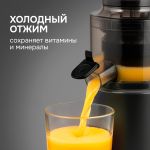 Её мощный шнек вращается медленно и бережно подталкивает плоды к ситу. Жмых удаляется автоматически через специальное отводное отверстие. Скорость низкая, поэтому нагрев сока от трения не происходит. При этом сохраняются до 4х раз больше полезных энзимов и до 6 раз больше Витамина С! Также, благодаря отсутствию обдува сока на высокой скорости вращения сита, сок не окисляется и не расслаивается как в традиционных соковыжималках. Структура его и цвет остаются естественными и ровными на протяжении долгого времени.