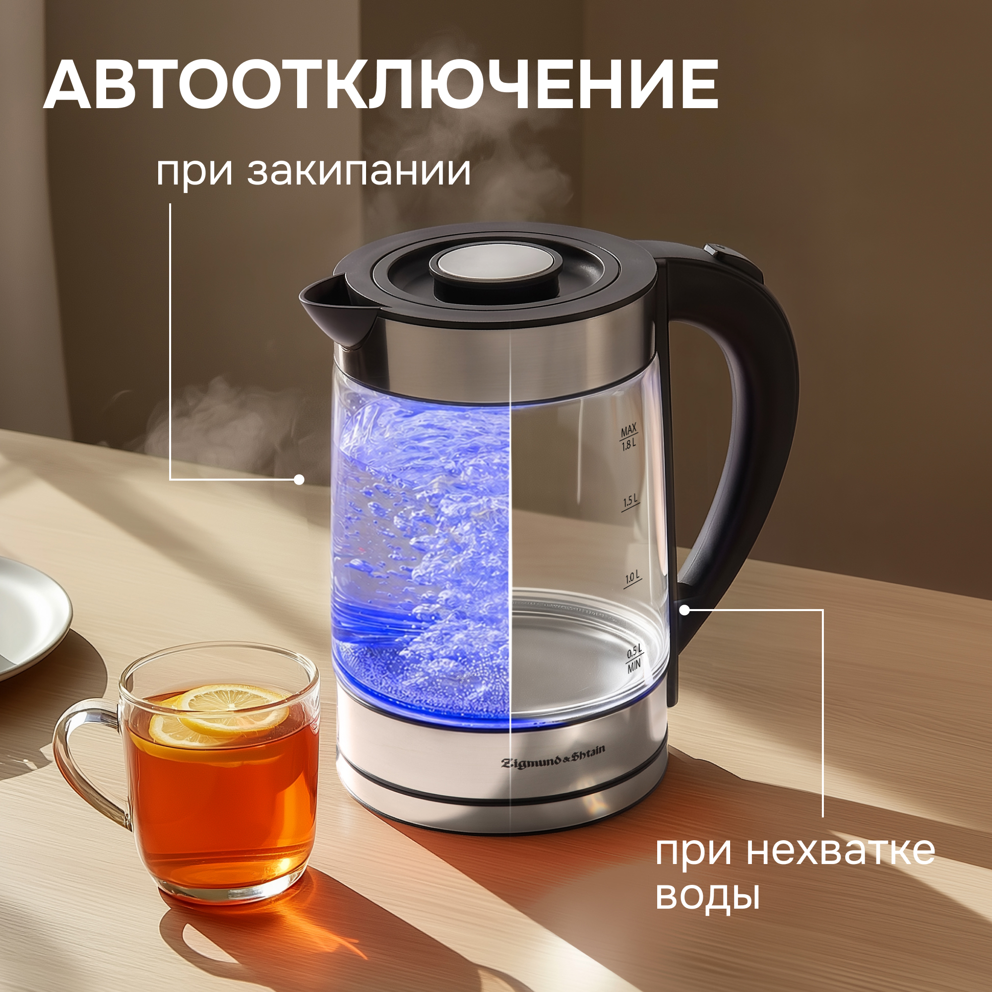 · 2 уровня защиты: автоматическое отключение при закипании, автоматическое отключение при недостаточном количестве воды