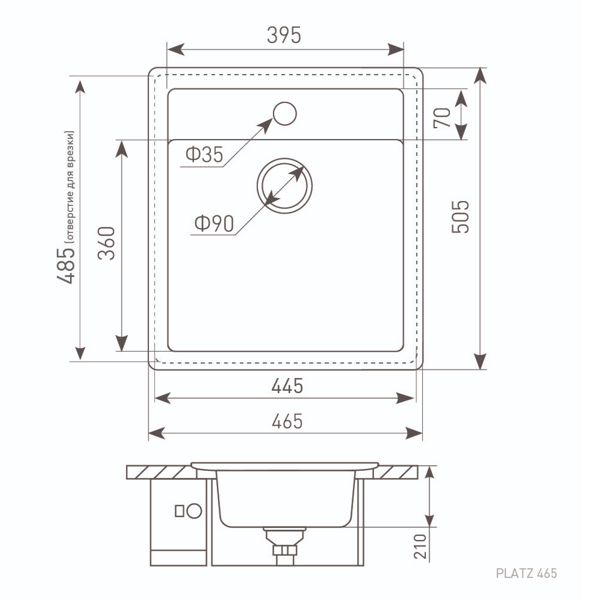 Благодаря небольшим габаритам, но при этом достаточно большой чаше, модель PLATZ 465 прекрасно подойдёт как для небольшой семьи, так и для холостятской квартиры, куда часто захаживают гости. Квадратная форма позволяет использовать мойку с максимальной отдачей. Такая мойка будет органично смотреться в интерьере каждой кухни – она будет геометрически перекликаться со столешницей прямоугольной формы и выгодно контрастировать с поверхностью с округлыми краями. Также, данная форма является выигрышной при размещении посуды разных габаритов, каким бы не был формат тарелки или чашки, они прекрасно и устойчиво встанут внутри чаши. Ещё одним явным преимуществом является глубина раковины в 21 см., чаша без труда вмещает набор посуды на 4 персоны и пару грязных сковородок или кастрюлю. Приятным дополнением является функциональная конструкция в виде верхнего бортика, который позволяет разместить моющие средства, губки или дозатор для моющих средств непосредственно на поверхности мойки.