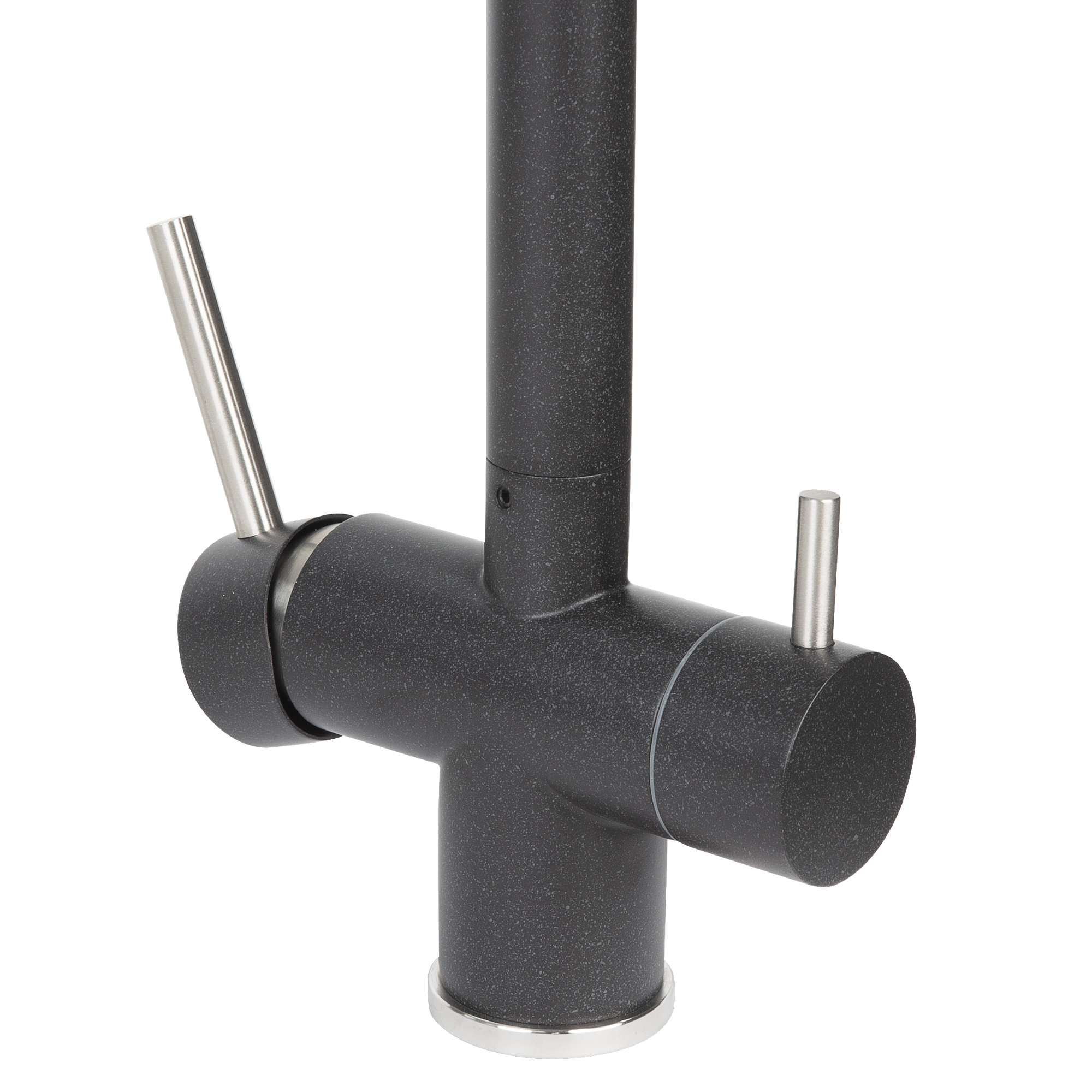Одноизливный – фильтрованная и водопроводная вода подаются через один аэратор. Это позволяет не нарушая общего вида смесителя, получать очищенную и водопроводную воду через одно устройство.