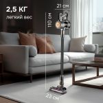 Вертикальная конструкция занимает минимум места при хранении, а лёгкий вес (2,25 кг) позволяет управлять пылесосом одной рукой. Идеально для уборки потолков, мебели и труднодоступных уголков.