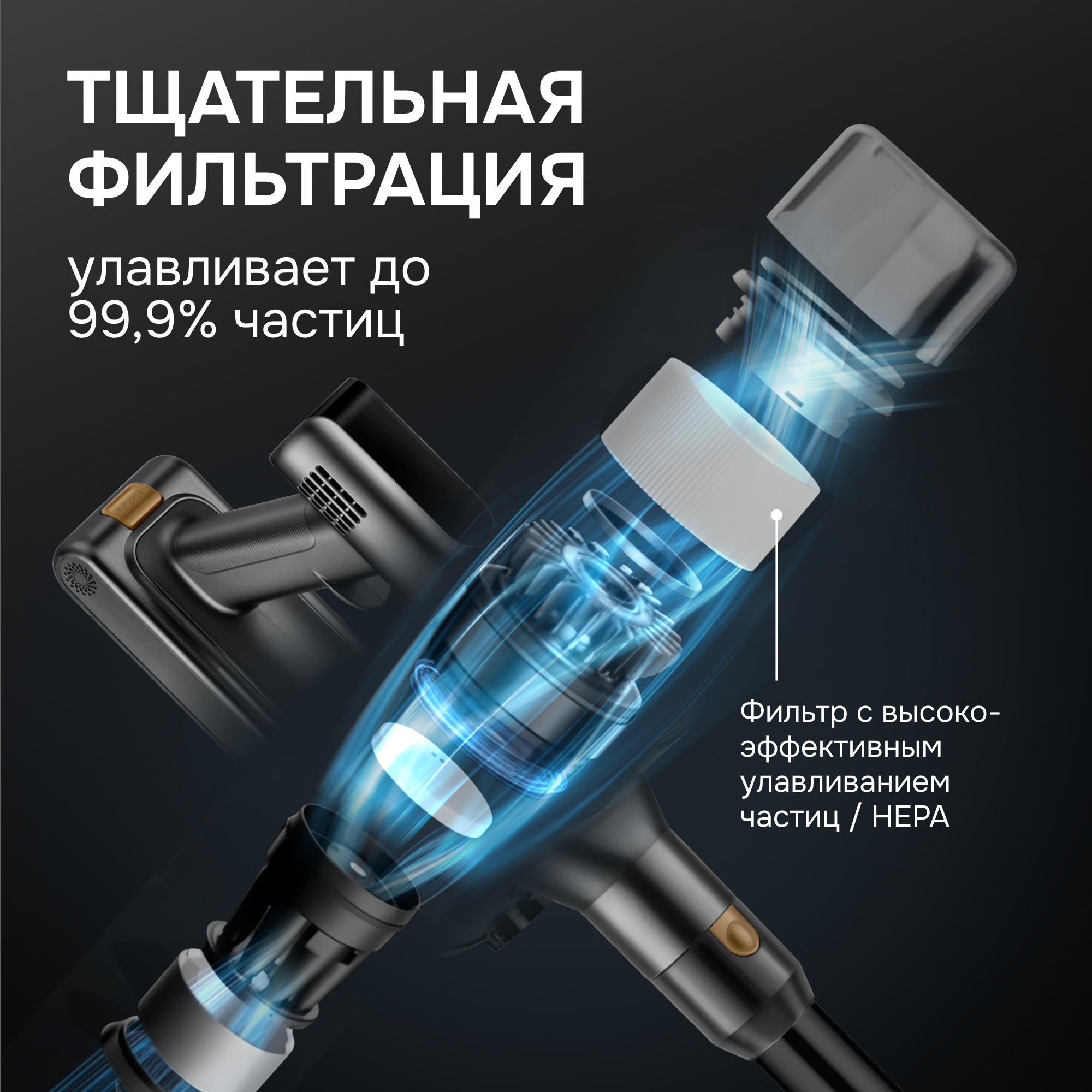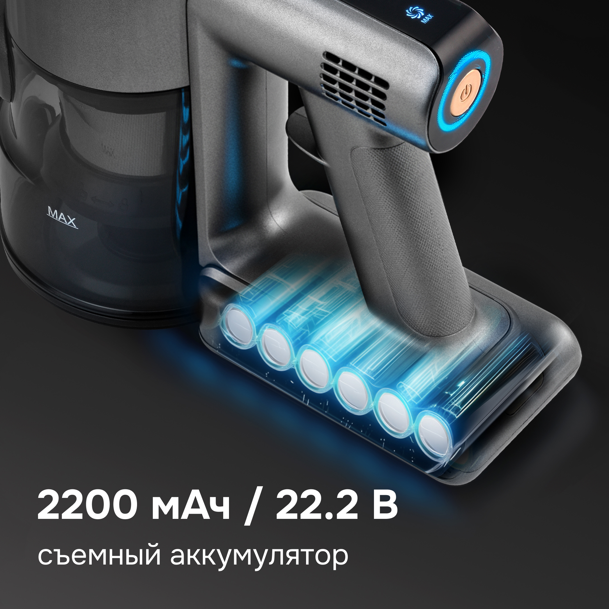 Беспроводной дизайн и литий‑ионный аккумулятор дают полную независимость от розеток. Убирайтесь где угодно: в квартире, на лестнице, балконе или даже в автомобиле — никаких проводов, только удобство.