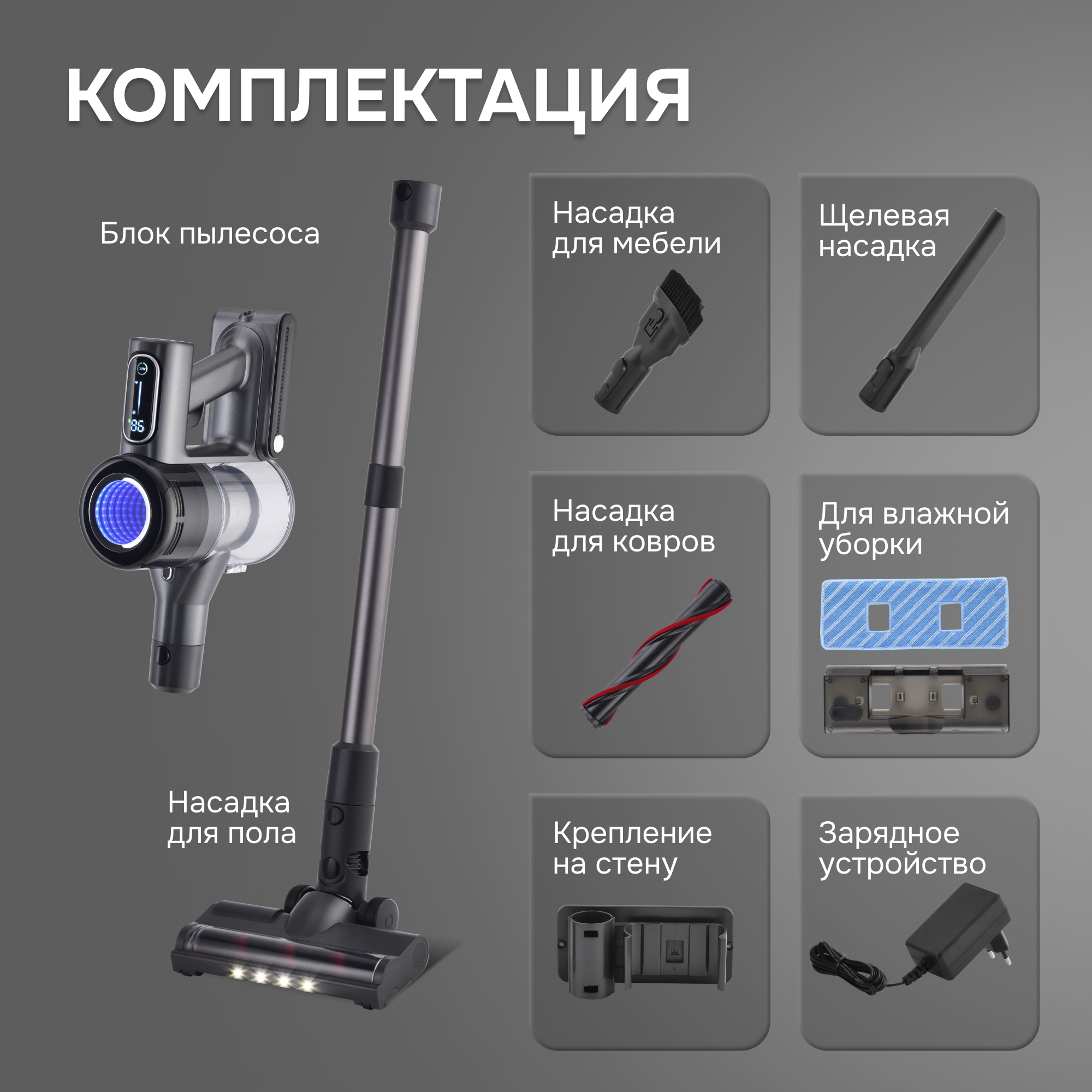 | Комплектация | аккумулятор, турбощетка, мини-турбощетка, щелевая насадка, насадка из микрофибры, насадка для мягкой мебели, сетевой адаптер питания, крепление на стену, крепежные элементы, НЕРА-фильтр, инструкция, г |